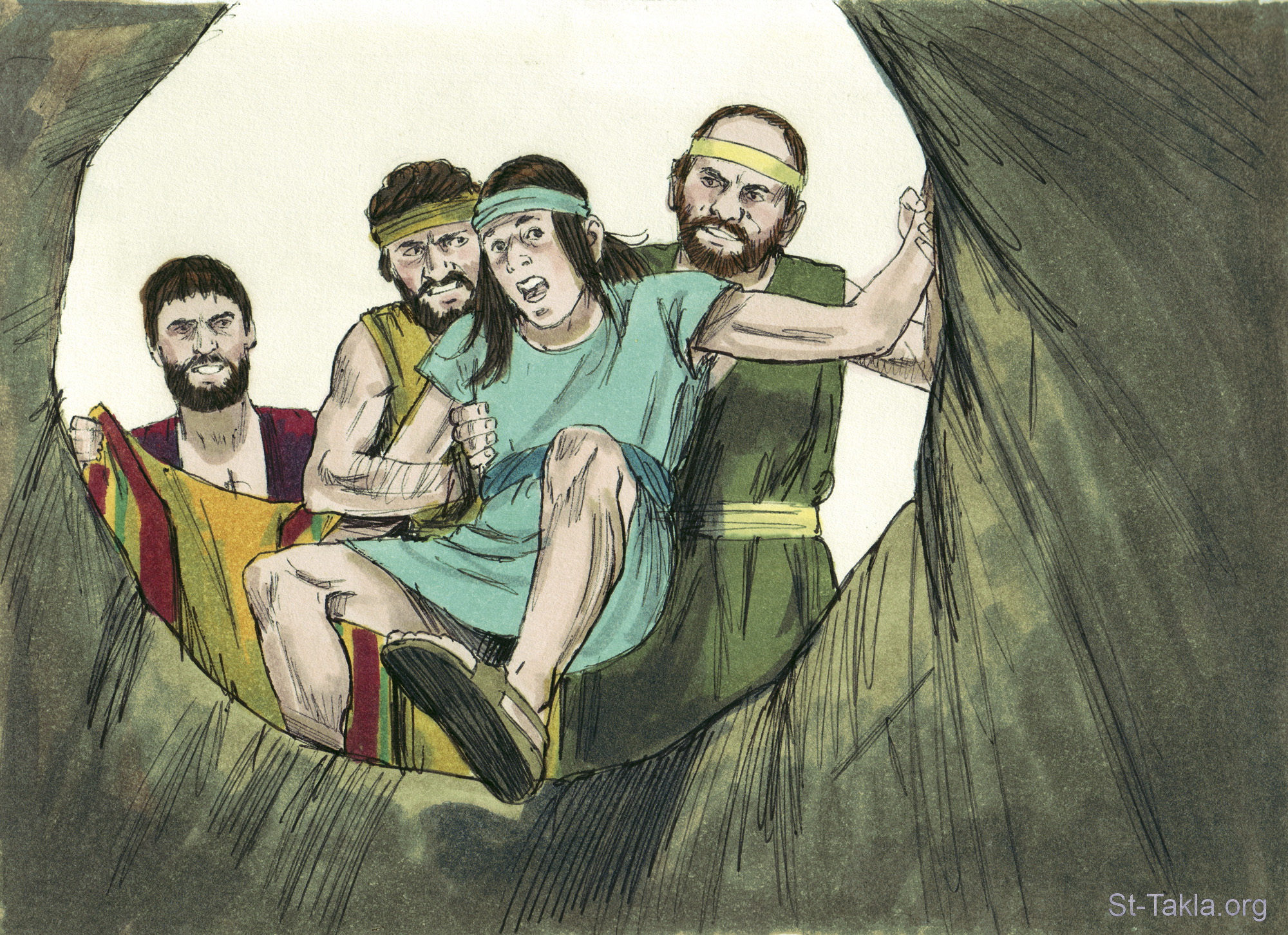 "فكان لما جاء يوسف إلى إخوته أنهم خلعوا عن يوسف قميصه، القميص الملون الذي عليه، وأخذوه وطرحوه في البئر. وأما البئر فكانت فارغة ليس فيها ماء" (التكوين 37: 23-24) - مجموعة "أخوة يوسف يطرحوه في بئر" (التكوين 37: 12-36) - صورة (11) - صور سفر التكوين، رسم جيمز بادجيت (1931-2009)، إصدار شركة سويت ميديا.