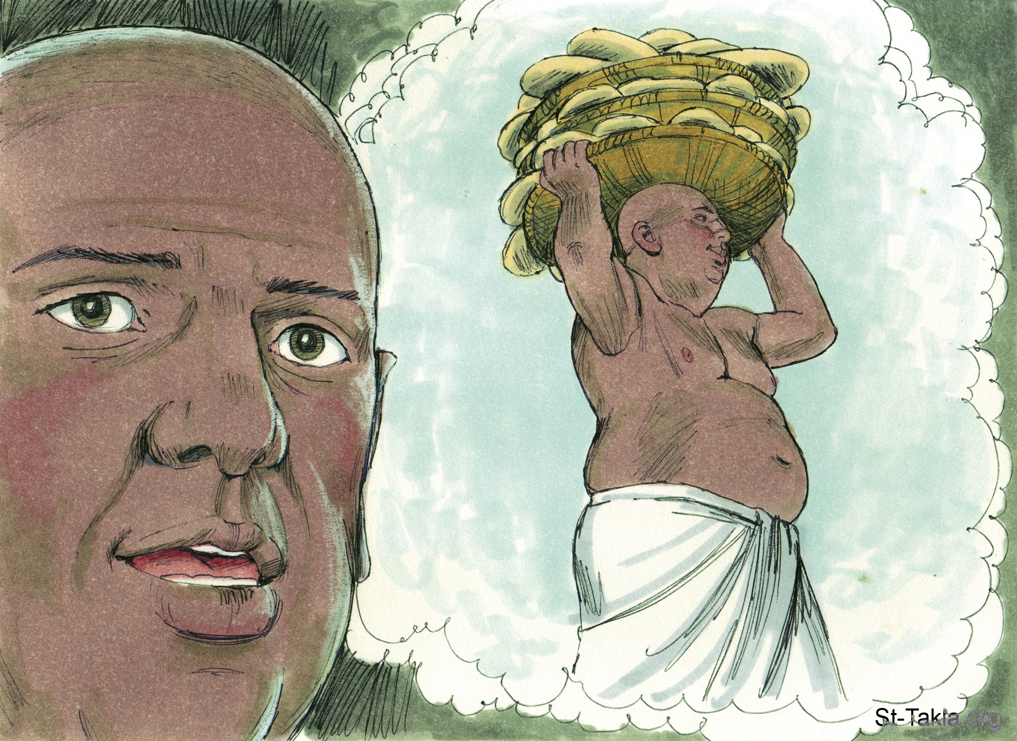 "فلما رأى رئيس الخبازين أنه عبر جيدا، قال ليوسف: «كنت أنا أيضا في حلمي وإذا ثلاثة سلال حوارى على رأسي" (التكوين 40: 16) - مجموعة "أحلام رئيس السقاة ورئيس الخبازين" (التكوين 40: 1-23) - صورة (6) - صور سفر التكوين، رسم جيمز بادجيت (1931-2009)، إصدار شركة سويت ميديا.
