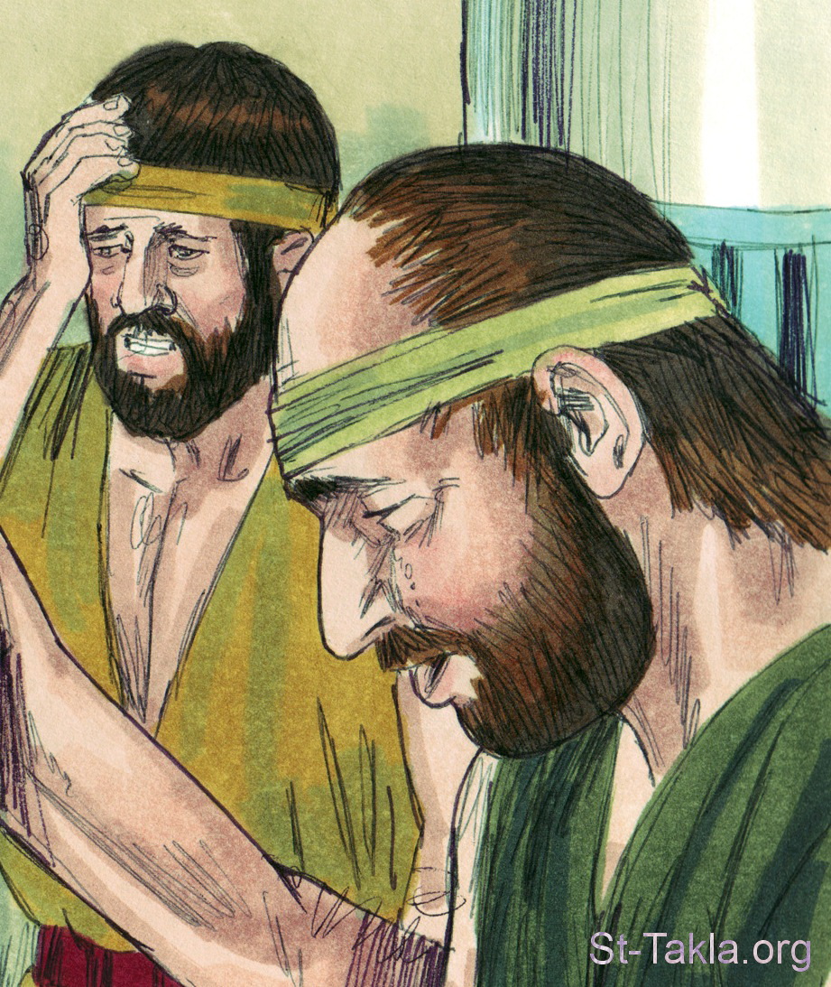 "وقالوا بعضهم لبعض: «حقا إننا مذنبون إلى أخينا الذي رأينا ضيقة نفسه لما استرحمنا ولم نسمع. لذلك جاءت علينا هذه الضيقة». فأجابهم رأوبين قائلا: «ألم أكلمكم قائلا: لا تأثموا بالولد، وأنتم لم تسمعوا؟ فهوذا دمه يطلب»" (التكوين 42: 21-22) - صور سفر التكوين، رسم جيمز بادجيت (1931-2009)، إصدار شركة سويت ميديا.