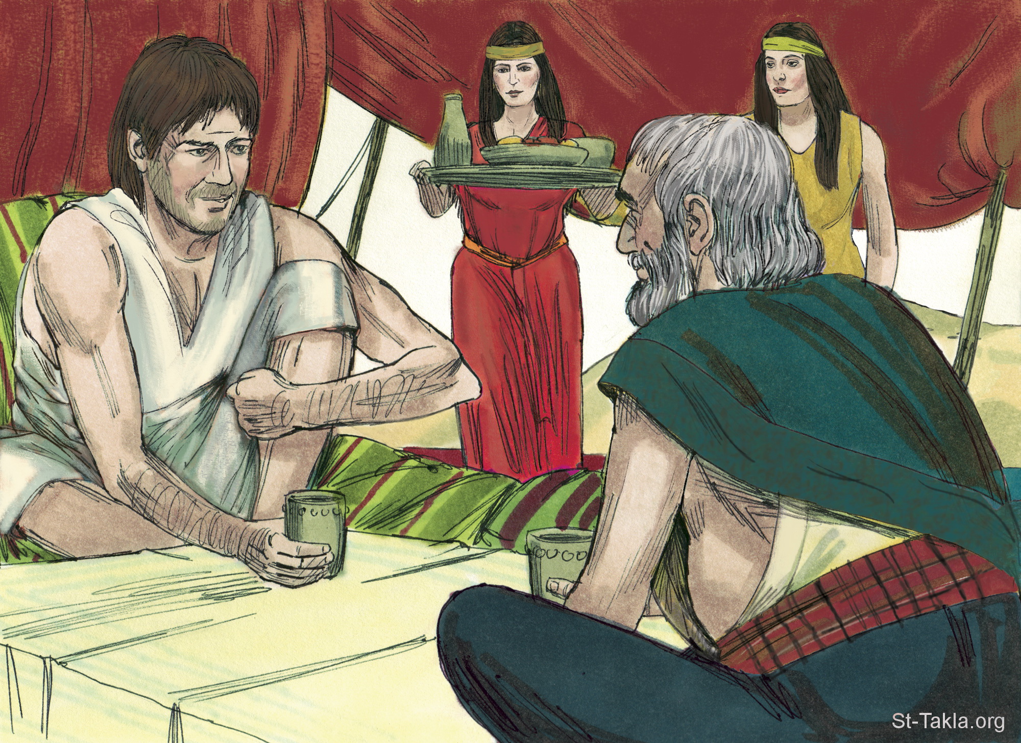 "فارتضى موسى أن يسكن مع الرجل (رعويل: يثرون)" (الخروج 2: 21) - مجموعة "موسى أمير مصر" (الخروج 2: 11-23) - صورة (12) - صور سفر الخروج، رسم جيمز بادجيت (1931-2009)، إصدار شركة سويت ميديا.