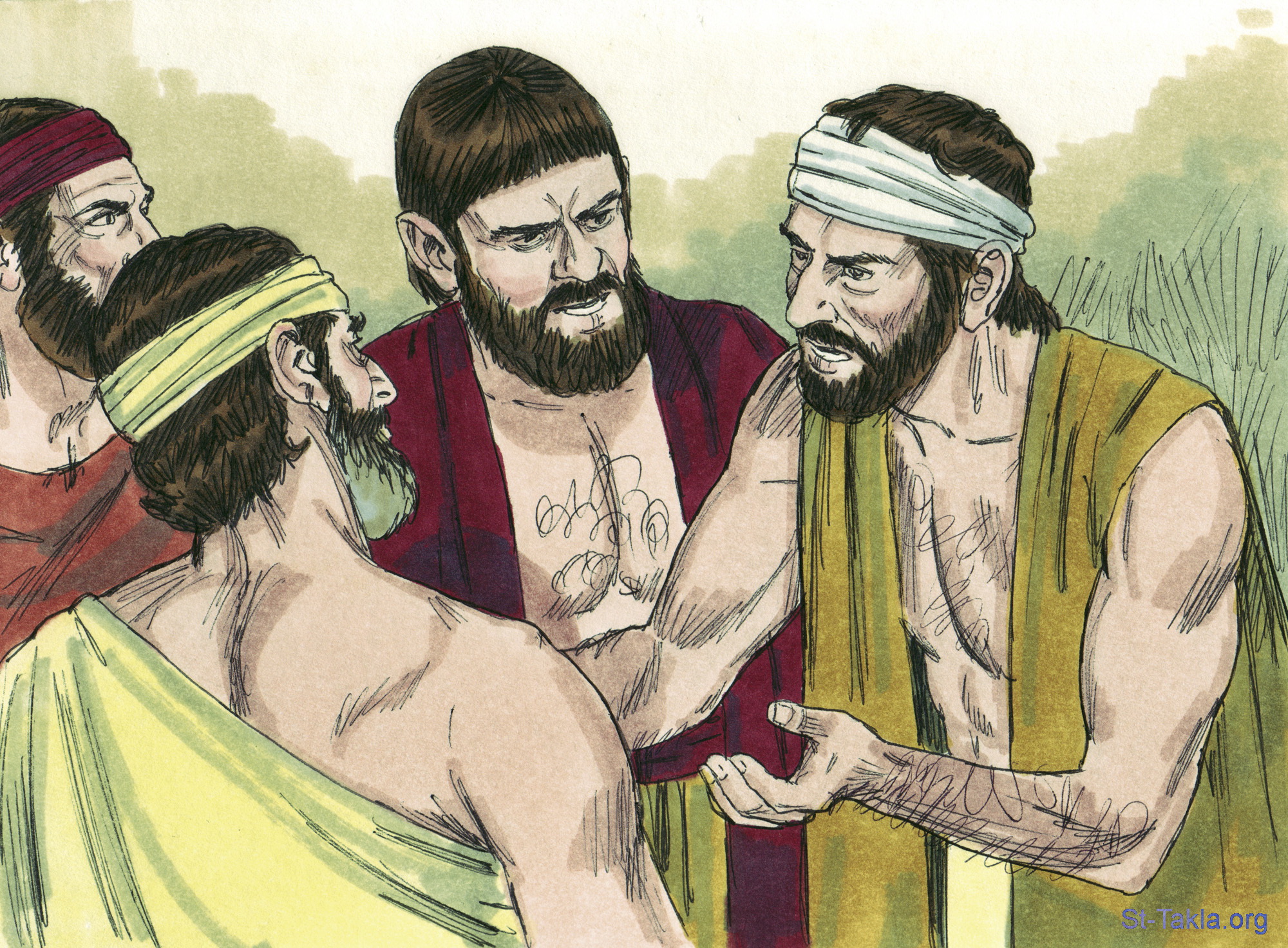"وصادفوا موسى وهارون واقفين للقائهم حين خرجوا من لدن فرعون. فقالوا لهما: «ينظر الرب إليكما ويقضي، لأنكما أنتنتما رائحتنا في عيني فرعون وفي عيون عبيده حتى تعطيا سيفا في أيديهم ليقتلونا»" (الخروج 5: 20-21) - مجموعة "موسى يقابل فرعون" (الخروج 4: 29 - 7: 16) - صورة (6) - صور سفر الخروج، رسم جيمز بادجيت (1931-2009)، إصدار شركة سويت ميديا.