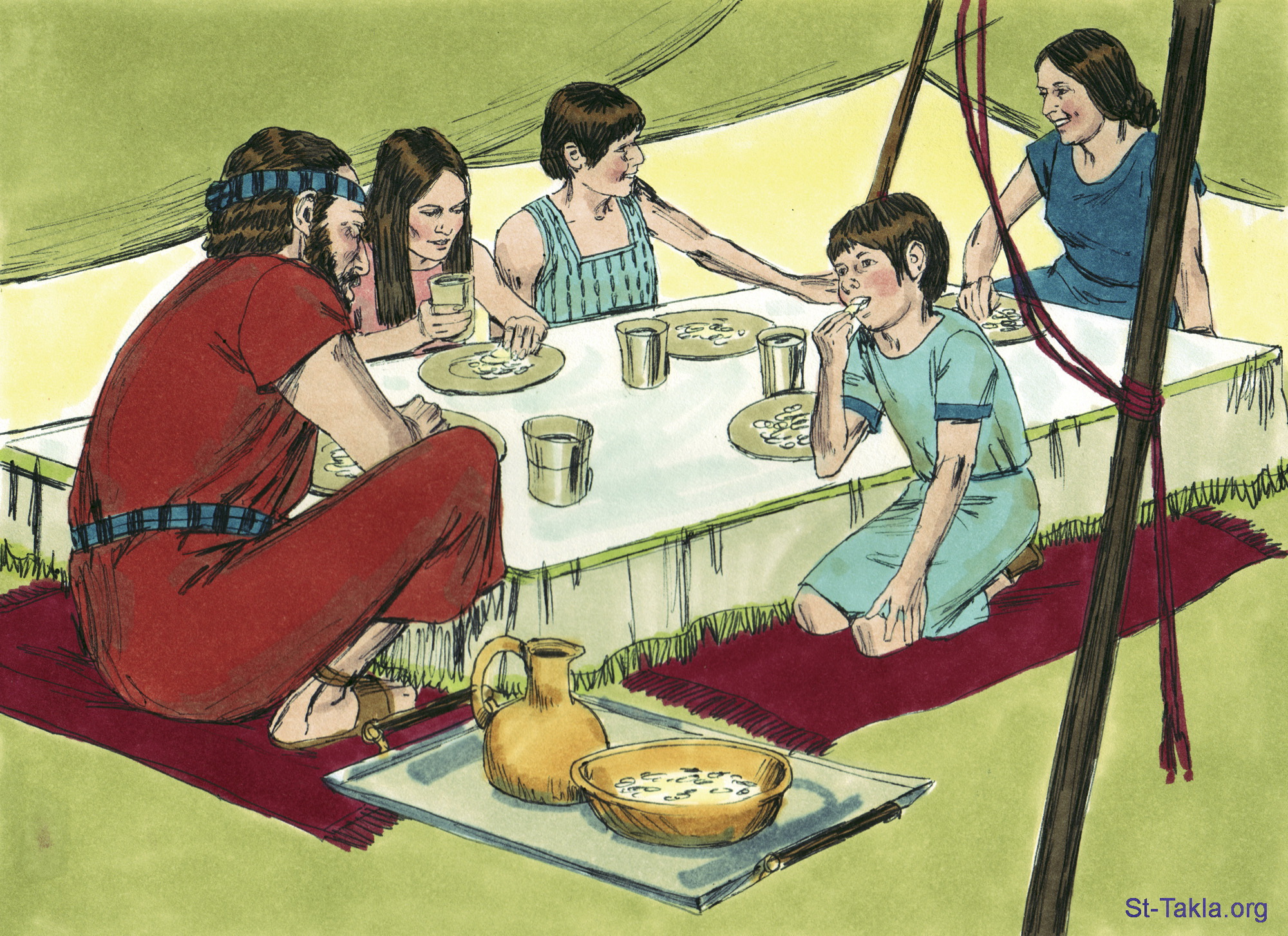 "فوضعوه إلى الغد كما أمر موسى، فلم ينتن ولا صار فيه دود" (الخروج 16: 24) - مجموعة "موسى: طعام وشراب البرية" (الخروج 15: 22 - 17: 7) - صورة (25) - صور سفر الخروج، رسم جيمز بادجيت (1931-2009)، إصدار شركة سويت ميديا.