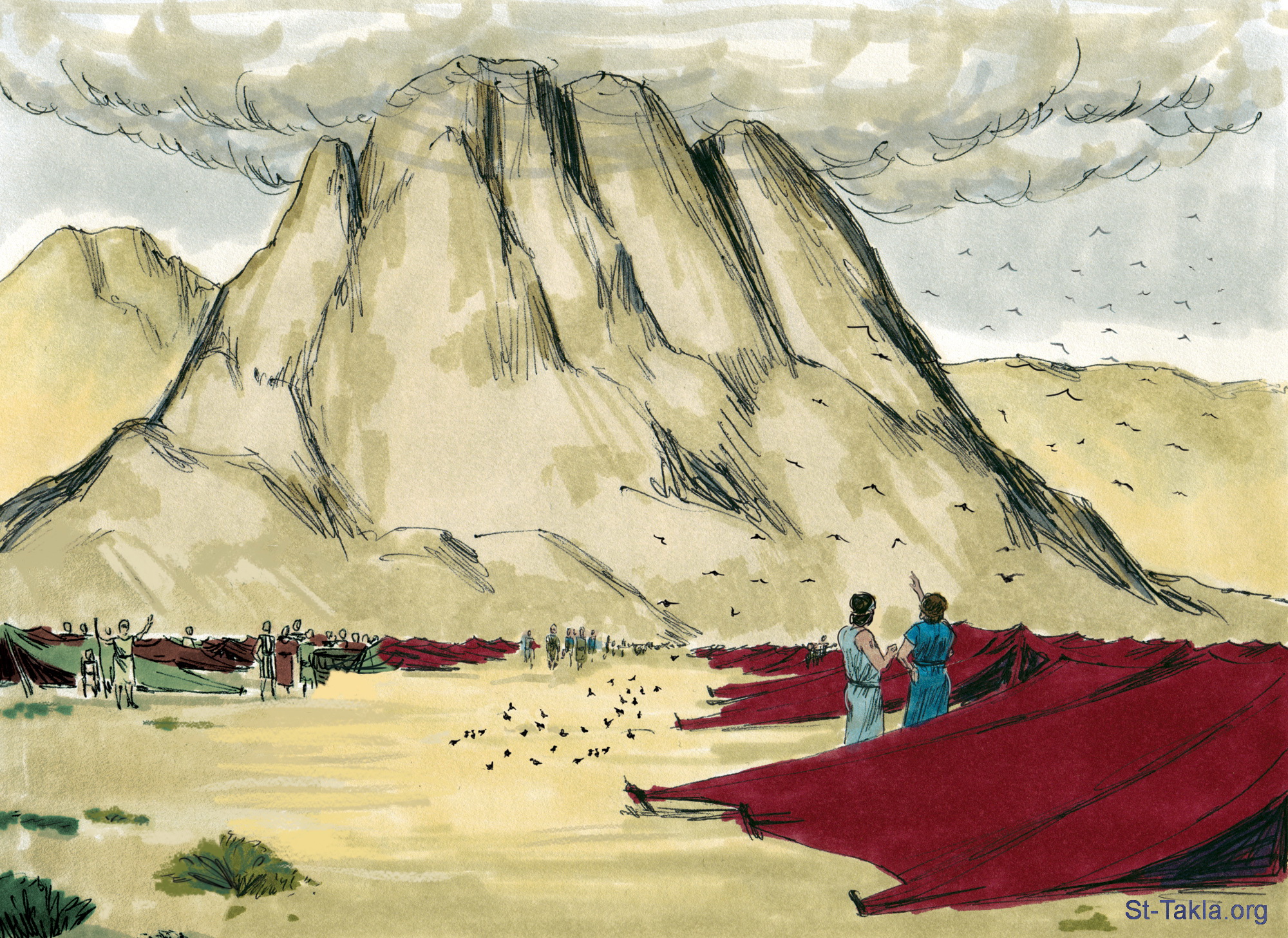 بعد هزيمة عماليق ذهب شعب بني إسرائيل إلى جبل الله في سيناء (الخروج 18: 1-5) - صور سفر الخروج، رسم جيمز بادجيت (1931-2009)، إصدار شركة سويت ميديا.