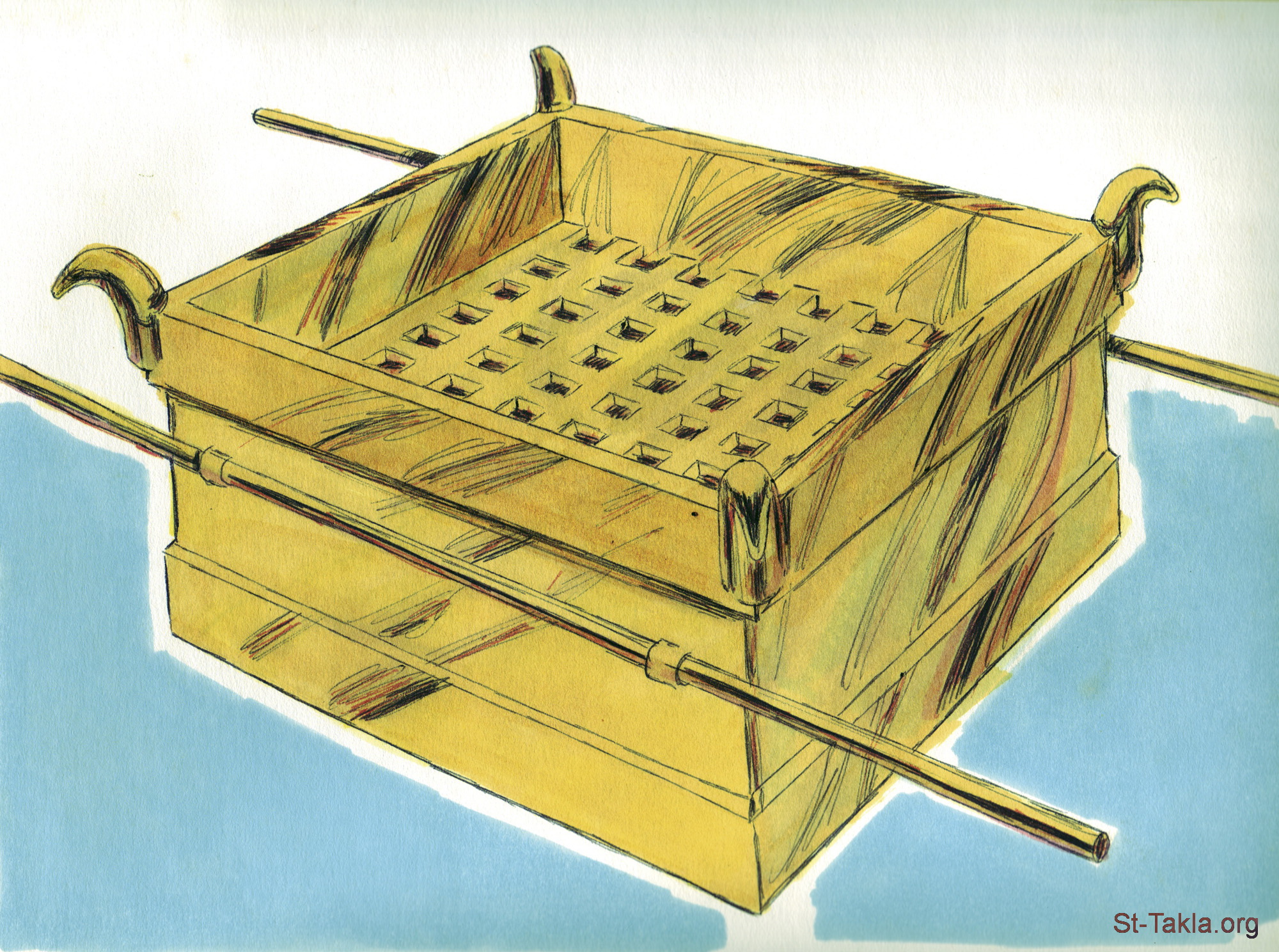 "وصنع مذبح المحرقة من خشب السنط، طوله خمس أذرع، وعرضه خمس أذرع، مربعا. وارتفاعه ثلاث أذرع. وصنع قرونه على زواياه الأربع. منه كانت قرونه. وغشاه بنحاس. وصنع جميع آنية المذبح: القدور والرفوش والمراكن والمناشل والمجامر، جميع آنيته صنعها من نحاس. وصنع للمذبح شباكة صنعة الشبكة من نحاس، تحت حاجبه من أسفل إلى نصفه. وسبك أربع حلقات في الأربعة الأطراف لشباكة النحاس بيوتا للعصوين. وصنع العصوين من خشب السنط وغشاهما بنحاس. وأدخل العصوين في الحلقات على جانبي المذبح لحمله بهما. مجوفا صنعه من ألواح" (الخروج 38: 1-7) - مجموعة "موسى وخيمة الاجتماع" (الخروج 25 - 40) - صورة (21) - صور سفر الخروج، رسم جيمز بادجيت (1931-2009)، إصدار شركة سويت ميديا.