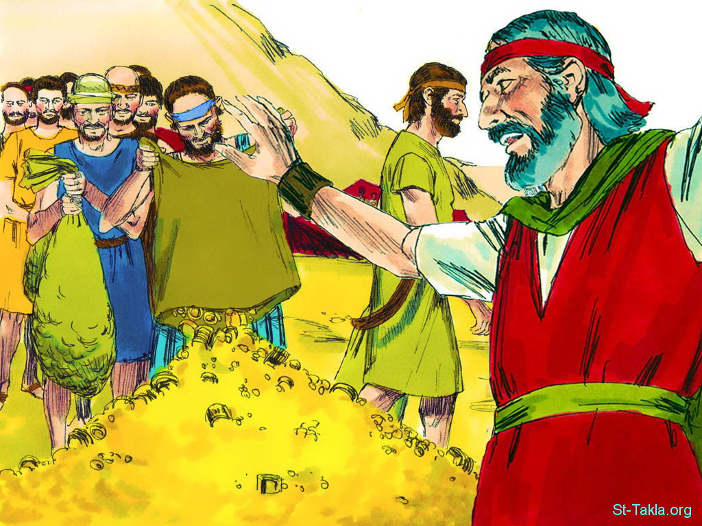 "وكلموا موسى قائلين: «يجيء الشعب بكثير فوق حاجة العمل للصنعة التي أمر الرب بصنعها». فأمر موسى أن ينفذوا صوتا في المحلة قائلين: «لا يصنع رجل أو امرأة عملا أيضا لتقدمة المقدس». فامتنع الشعب عن الجلب" (الخروج 36: 5-6) - مجموعة "موسى وخيمة الاجتماع" (الخروج 25 - 40) - صورة (9) - صور سفر الخروج، رسم جيمز بادجيت (1931-2009)، إصدار شركة سويت ميديا.