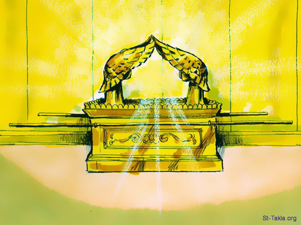 "وأخذ الشهادة وجعلها في التابوت، ووضع العصوين على التابوت من فوق. وأدخل التابوت إلى المسكن، ووضع حجاب السجف وستر تابوت الشهادة، كما أمر الرب موسى" (الخروج 40: 20-21) - مجموعة "موسى وخيمة الاجتماع" (الخروج 25 - 40) - صورة (31) - صور سفر الخروج، رسم جيمز بادجيت (1931-2009)، إصدار شركة سويت ميديا.