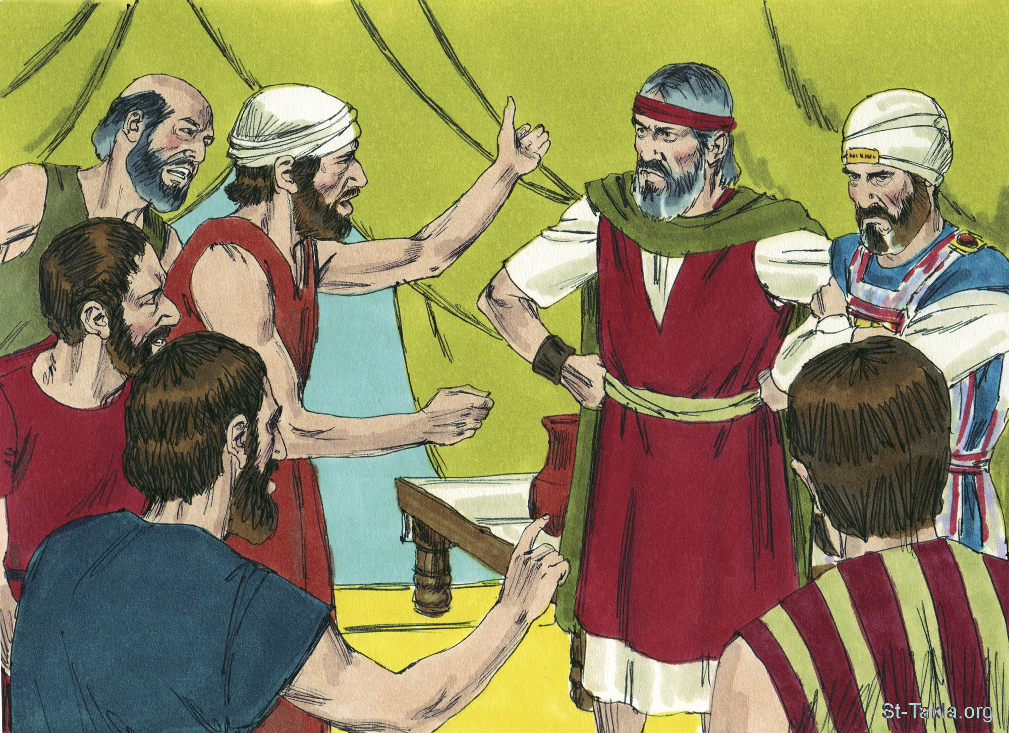 "فرفعت كل الجماعة صوتها وصرخت، وبكى الشعب تلك الليلة. وتذمر على موسى وعلى هارون جميع بني إسرائيل، وقال لهما كل الجماعة: «ليتنا متنا في أرض مصر، أو ليتنا متنا في هذا القفر! ولماذا أتى بنا الرب إلى هذه الأرض لنسقط بالسيف؟ تصير نساؤنا وأطفالنا غنيمة. أليس خيرا لنا أن نرجع إلى مصر؟» فقال بعضهم لبعض: «نقيم رئيسا ونرجع إلى مصر»" (العدد 14: 1-4) - مجموعة "إرسال الجواسيس الاثني عشر إلى كنعان" (العدد 13: 1 - العدد 14: 45) - صورة (14) - صور سفر العدد، رسم جيمز بادجيت (1931-2009)، إصدار شركة سويت ميديا.