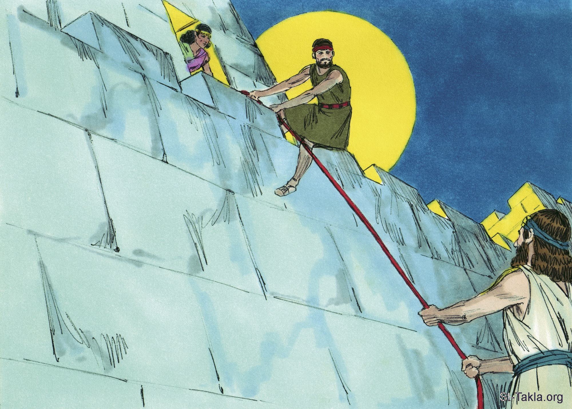 "فأنزلتهما بحبل من الكوة، لأن بيتها بحائط السور، وهي سكنت بالسور. وقالت لهما: «اذهبا إلى الجبل لئلا يصادفكما السعاة، واختبئا هناك ثلاثة أيام حتى يرجع السعاة، ثم اذهبا في طريقكما»." (يشوع 2: 15-16) - مجموعة "راحاب والجواسيس" (يشوع 2: 1-24) - صورة (15) - صور سفر يشوع، رسم جيمز بادجيت (1931-2009)، إصدار شركة سويت ميديا.
