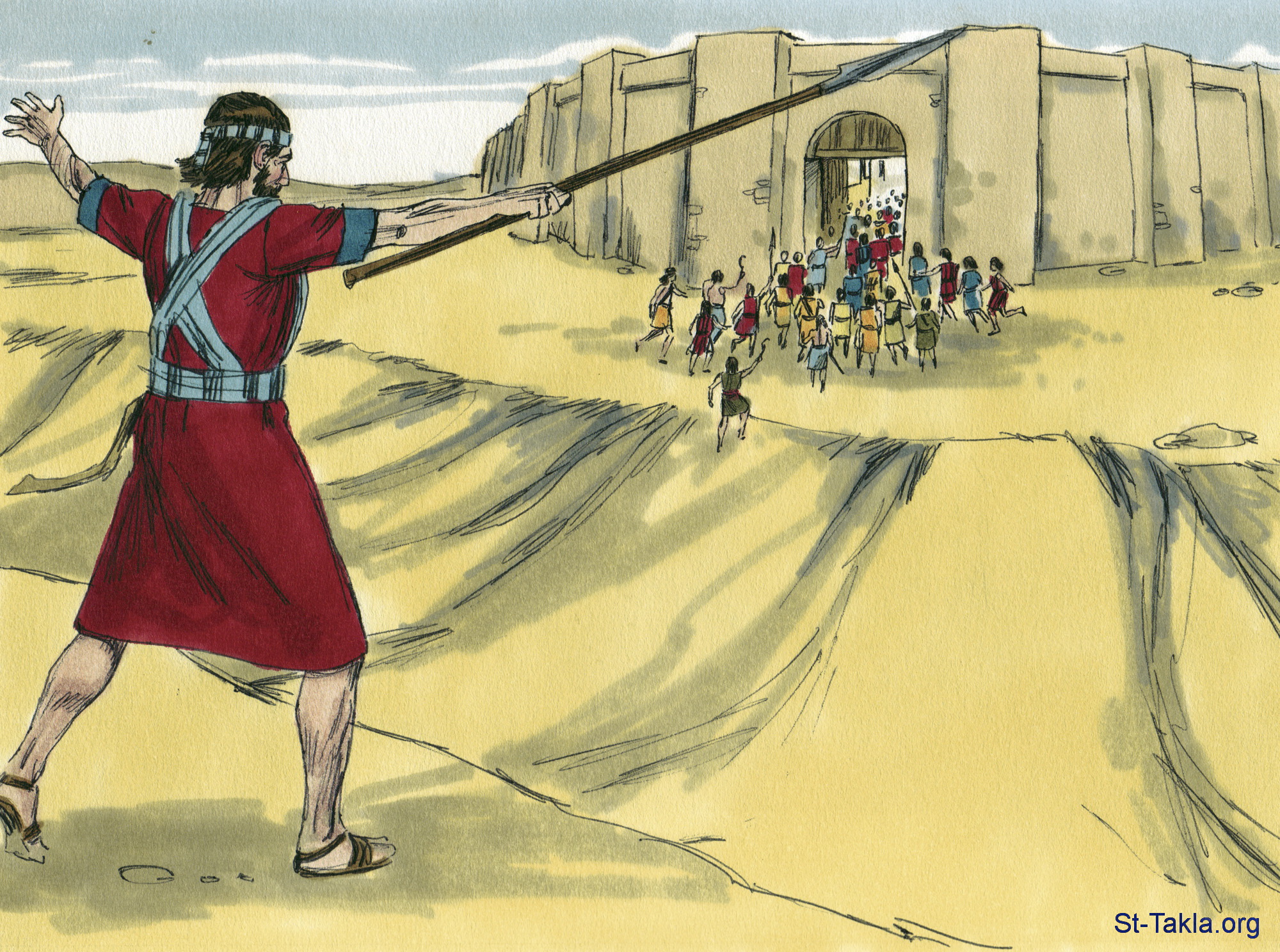 "فقال الرب ليشوع: «مد المزراق الذي بيدك نحو عاي لأني بيدك أدفعها». فمد يشوع المزراق الذي بيده نحو المدينة" (يشوع 8: 18) - مجموعة "الهجوم الثاني على عاي" (يشوع 8: 1-35) - صورة (8) - صور سفر يشوع، رسم جيمز بادجيت (1931-2009)، إصدار شركة سويت ميديا.