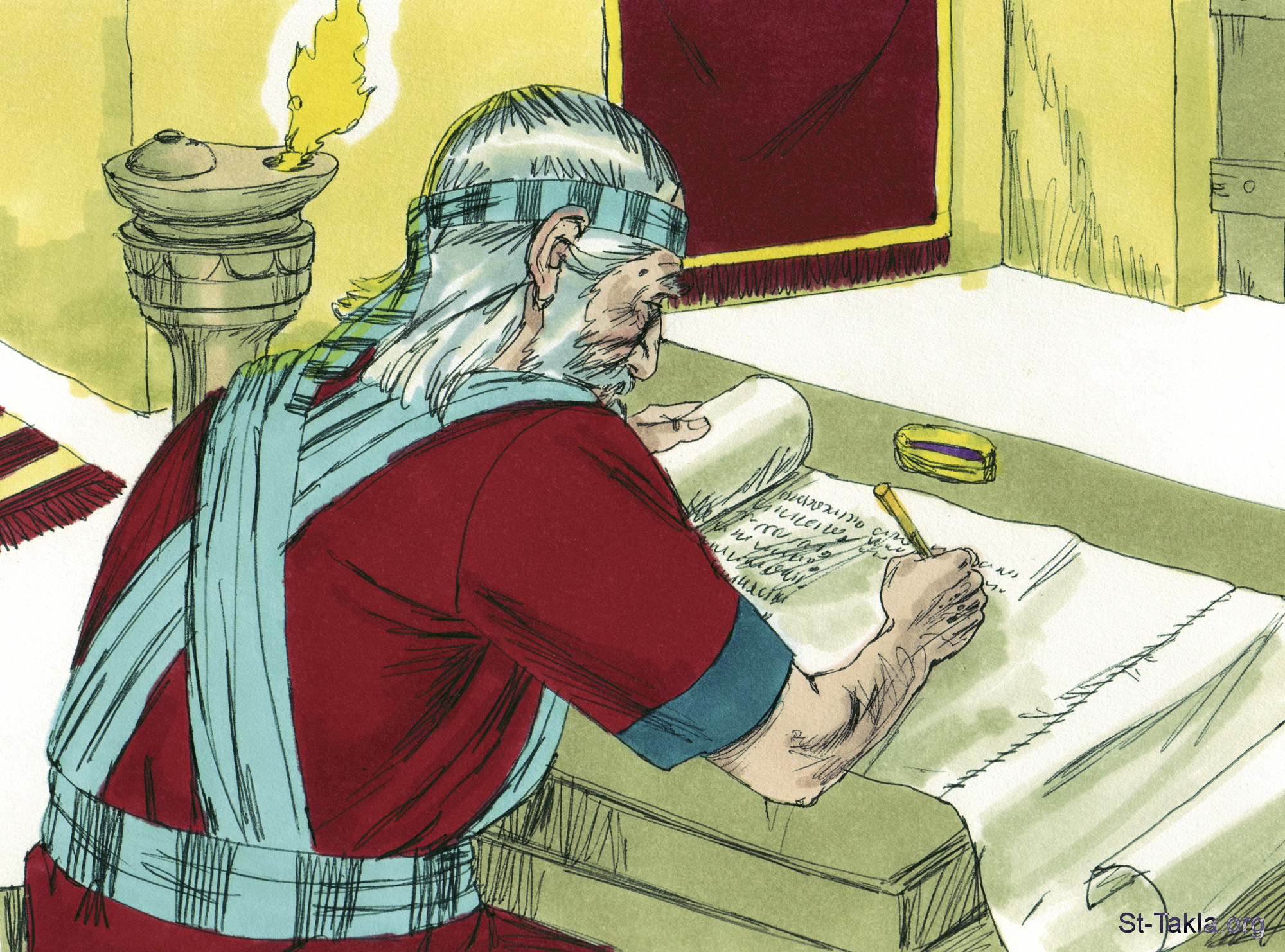 "فقال يشوع للشعب: «أنتم شهود على أنفسكم أنكم قد اخترتم لأنفسكم الرب لتعبدوه». فقالوا: «نحن شهود».. وكتب يشوع هذا الكلام في سفر شريعة الله" (يشوع 24: 22، 26) - مجموعة "تحدي يشوع الأخير" (يشوع 23: 1 - يشوع 24: 33) - صورة (8) - صور سفر يشوع، رسم جيمز بادجيت (1931-2009)، إصدار شركة سويت ميديا.