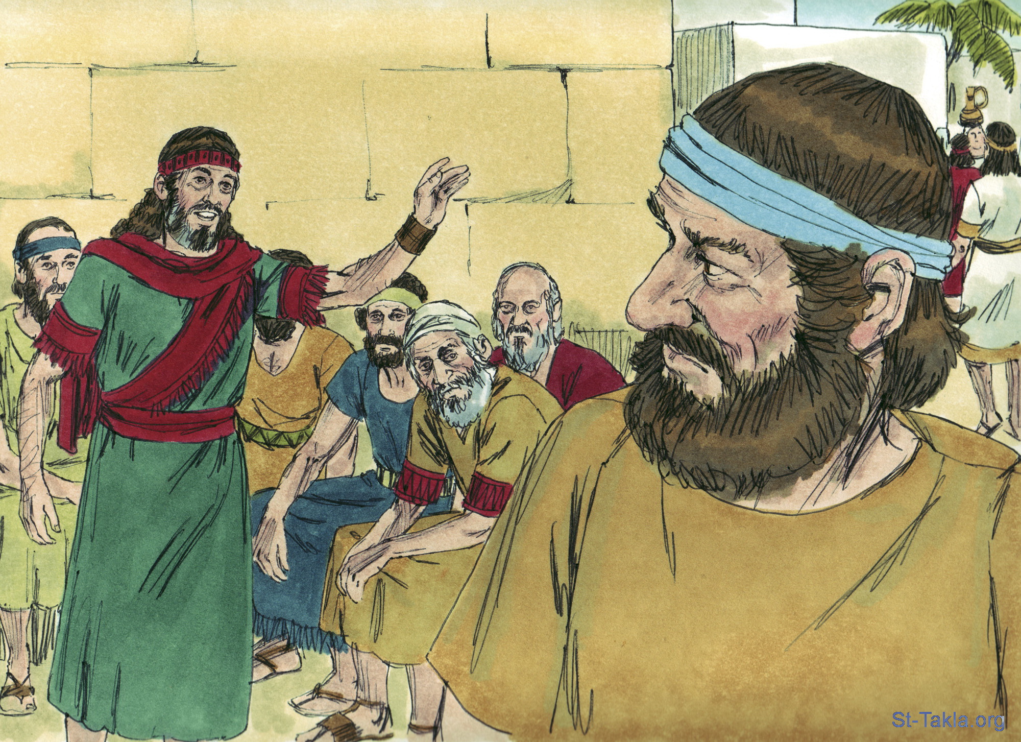 "فصعد بوعز إلى الباب وجلس هناك. وإذا بالولي الذي تكلم عنه بوعز عابر. فقال: «مل واجلس هنا أنت يا فلان الفلاني». فمال وجلس. ثم أخذ عشرة رجال من شيوخ المدينة وقال لهم: «اجلسوا هنا». فجلسوا" (راعوث 4: 1-2) - صور سفر راعوث، رسم جيمز بادجيت (1931-2009)، إصدار شركة سويت ميديا.
