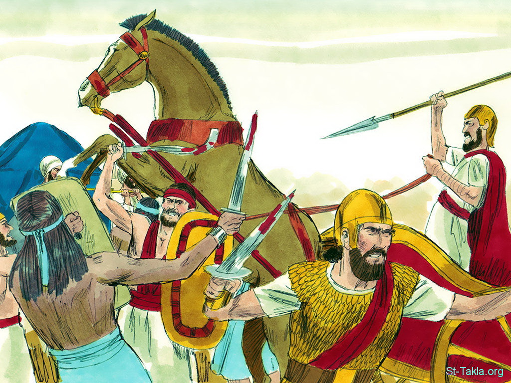 "وكان عند دخول تابوت عهد الرب إلى المحلة أن جميع إسرائيل هتفوا هتافا عظيما حتى ارتجت الأرض. فسمع الفلسطينيون صوت الهتاف فقالوا: «ما هو صوت هذا الهتاف العظيم في محلة العبرانيين؟» وعلموا أن تابوت الرب جاء إلى المحلة. فخاف الفلسطينيون لأنهم قالوا: «قد جاء الله إلى المحلة». وقالوا: «ويل لنا لأنه لم يكن مثل هذا منذ أمس ولا ما قبله! ويل لنا! من ينقذنا من يد هؤلاء الآلهة القادرين؟ هؤلاء هم الآلهة الذين ضربوا مصر بجميع الضربات في البرية. تشددوا وكونوا رجالا أيها الفلسطينيون لئلا تستعبدوا للعبرانيين كما استعبدوا هم لكم. فكونوا رجالا وحاربوا». فحارب الفلسطينيون، وانكسر إسرائيل وهربوا كل واحد إلى خيمته. وكانت الضربة عظيمة جدا، وسقط من إسرائيل ثلاثون ألف راجل. وأخذ تابوت الله، ومات ابنا عالي حفني وفينحاس" (صموئيل الأول 4: 5-11) - مجموعة "الله يتحدث مع الطفل صموئيل" (صموئيل الأول 2: 1, صموئيل الأول 4: 22) - صورة (18) - صور سفر صموئيل الأول، رسم جيمز بادجيت (1931-2009)، إصدار شركة سويت ميديا.
