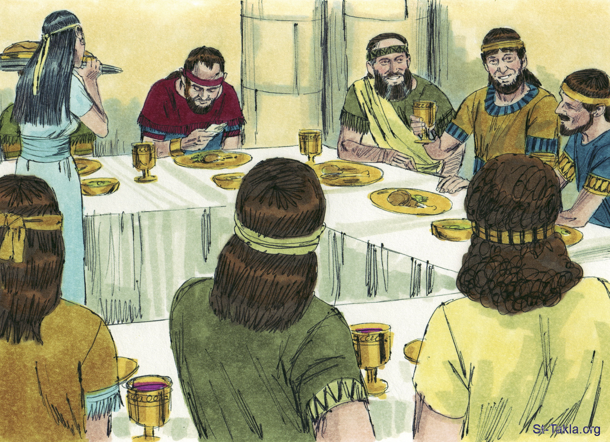 "ودعا جميع إخوته بني الملك وجميع رجال يهوذا عبيد الملك، وأما ناثان النبي وبناياهو والجبابرة وسليمان أخوه فلم يدعهم" (الملوك الأول 1: 9-10) - مجموعة "مسح سليمان ملكًا" (ملوك الأول 1 - ملوك الأول 2) - صورة (4) - صور سفر الملوك الأول، رسم جيمز بادجيت (1931-2009)، إصدار شركة سويت ميديا.