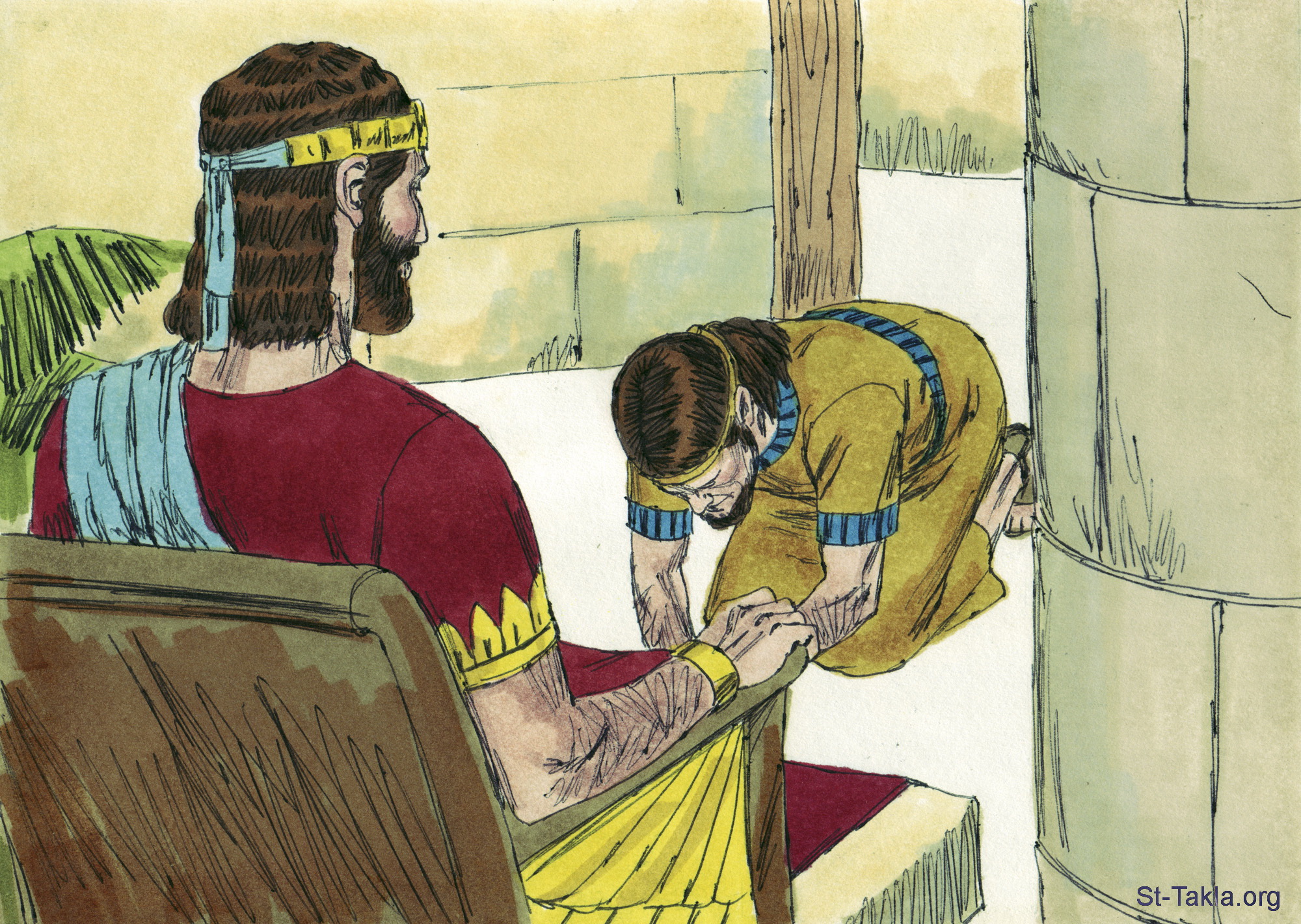 أدونيا: "فأرسل الملك سليمان فأنزلوه عن المذبح، فأتى وسجد للملك سليمان. فقال له سليمان: «اذهب إلى بيتك»" (الملوك الأول 1: 53) - مجموعة "مسح سليمان ملكًا" (ملوك الأول 1 - ملوك الأول 2) - صورة (12) - صور سفر الملوك الأول، رسم جيمز بادجيت (1931-2009)، إصدار شركة سويت ميديا.