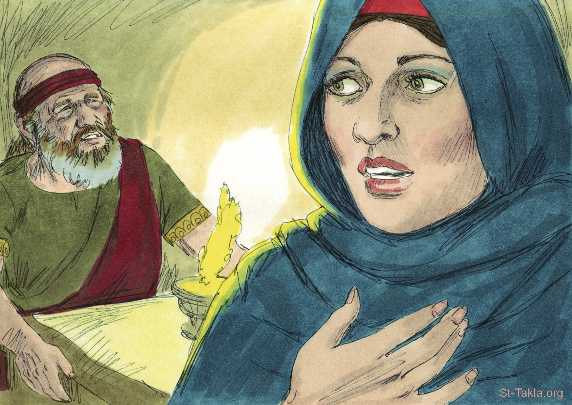 "ففعلت امرأة يربعام هكذا، وقامت وذهبت إلى شيلوه ودخلت بيت أخيا. وكان أخيا لا يقدر أن يبصر لأنه قد قامت عيناه بسبب شيخوخته. وقال الرب لأخيا: «هوذا امرأة يربعام آتية لتسأل منك شيئا من جهة ابنها لأنه مريض. فقل لها: كذا وكذا، فإنها عند دخولها تتنكر». فلما سمع أخيا حس رجليها وهي داخلة في الباب قال: «ادخلي يا امرأة يربعام. لماذا تتنكرين وأنا مرسل إليك بقول قاس؟ اذهبي قولي ليربعام: هكذا قال الرب إله إسرائيل: من أجل أني قد رفعتك من وسط الشعب وجعلتك رئيسا على شعبي إسرائيل، وشققت المملكة من بيت داود وأعطيتك إياها، ولم تكن كعبدي داود الذي حفظ وصاياي والذي سار ورائي بكل قلبه ليفعل ما هو مستقيم فقط في عيني، وقد ساء عملك أكثر من جميع الذين كانوا قبلك، فسرت وعملت لنفسك آلهة أخرى ومسبوكات لتغيظني، وقد طرحتني وراء ظهرك. لذلك هأنذا جالب شرا على بيت يربعام، وأقطع ليربعام كل بائل بحائط محجوزا ومطلقا في إسرائيل، وأنزع آخر بيت يربعام كما ينزع البعر حتى يفنى. من مات ليربعام في المدينة تأكله الكلاب، ومن مات في الحقل تأكله طيور السماء، لأن الرب تكلم. وأنت فقومي وانطلقي إلى بيتك، وعند دخول رجليك المدينة يموت الولد، ويندبه جميع إسرائيل ويدفنونه، لأن هذا وحده من يربعام يدخل القبر، لأنه وجد فيه أمر صالح نحو الرب إله إسرائيل في بيت يربعام. ويقيم الرب لنفسه ملكا على إسرائيل يقرض بيت يربعام هذا اليوم. وماذا؟ الآن أيضا! ويضرب الرب إسرائيل كاهتزاز القصب في الماء، ويستأصل إسرائيل عن هذه الأرض الصالحة التي أعطاها لآبائهم، ويبددهم إلى عبر النهر لأنهم عملوا سواريهم وأغاظوا الرب. ويدفع إسرائيل من أجل خطايا يربعام الذي أخطأ وجعل إسرائيل يخطئ»" (الملوك الأول 14: 4-16) - صور سفر الملوك الأول، رسم جيمز بادجيت (1931-2009)، إصدار شركة سويت ميديا.