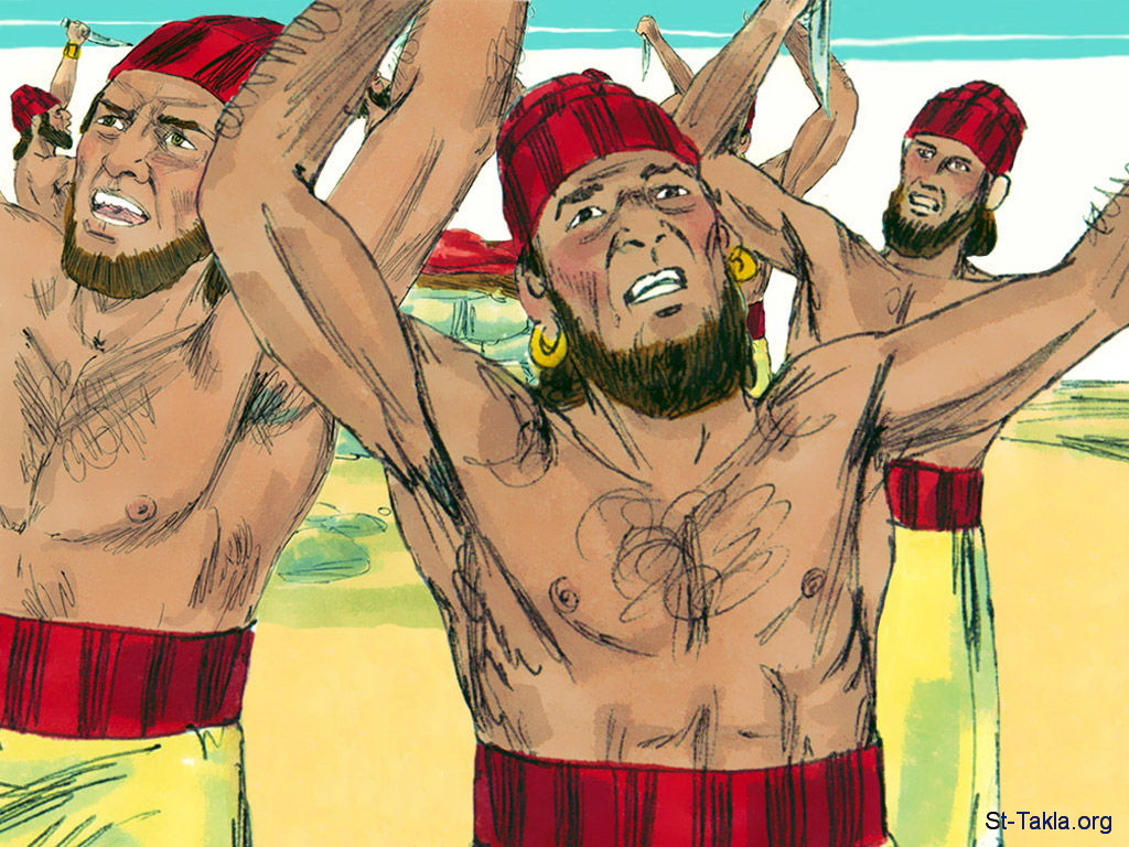 "فصرخوا بصوت عال، وتقطعوا حسب عادتهم بالسيوف والرماح حتى سال منهم الدم. ولما جاز الظهر، وتنبأوا إلى حين إصعاد التقدمة، ولم يكن صوت ولا مجيب ولا مصغ" (الملوك الأول 18: 28-29) - مجموعة "إيليا وأنبياء البعل" (ملوك الأول 18: 1-40) - صورة (15) - صور سفر الملوك الأول، رسم جيمز بادجيت (1931-2009)، إصدار شركة سويت ميديا.