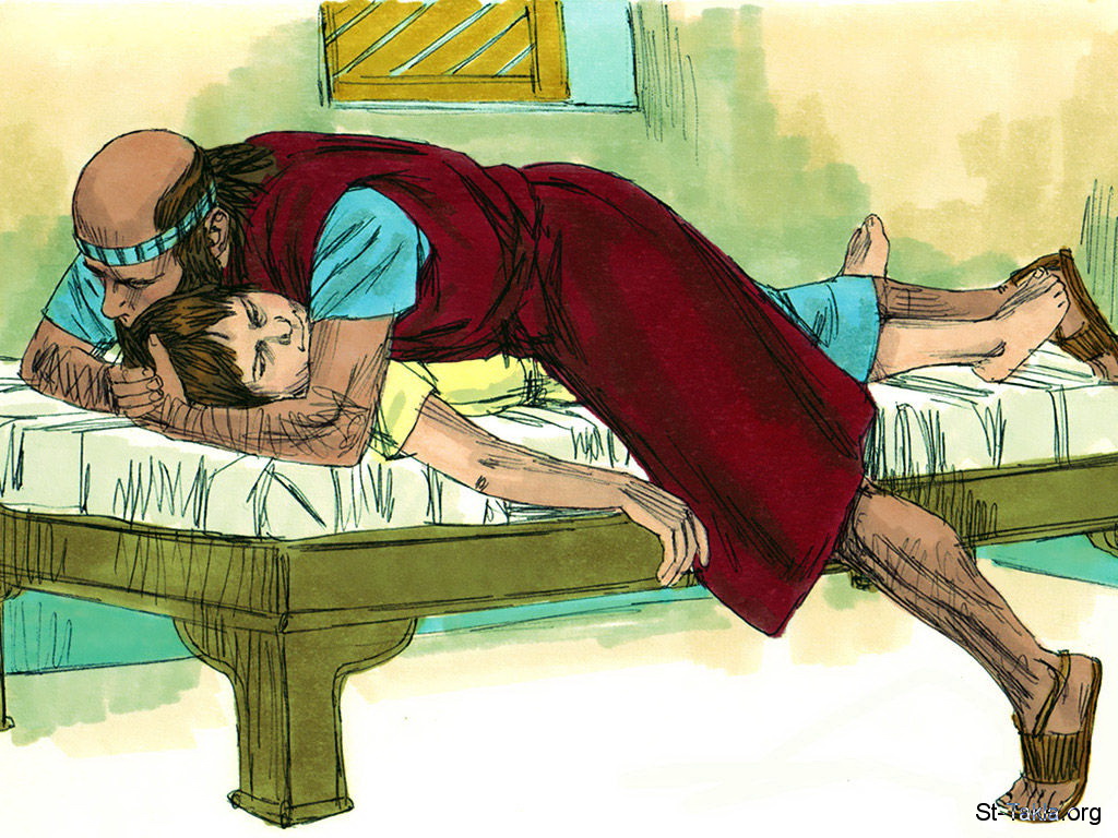 "ثم صعد واضطجع فوق الصبي ووضع فمه على فمه، وعينيه على عينيه، ويديه على يديه، وتمدد عليه فسخن جسد الولد. ثم عاد وتمشى في البيت تارة إلى هنا وتارة إلى هناك، وصعد وتمدد عليه فعطس الصبي سبع مرات، ثم فتح الصبي عينيه" (الملوك الثاني 4: 34-35) - مجموعة "إليشع وإقامة صبي من الموت" (ملوك الثاني 4: 8-37) - صورة (15) - صور سفر الملوك الثاني، رسم جيمز بادجيت (1931-2009)، إصدار شركة سويت ميديا.