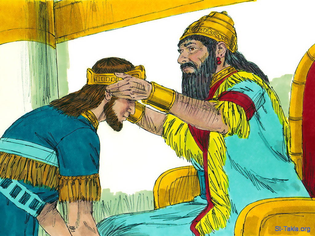 "فاستجاب له وسمع تضرعه، ورده إلى أورشليم إلى مملكته. فعلم منسى أن الرب هو الله" (أخبار الأيام الثاني 33: 13) - مجموعة "منسى الملك العاق" (ملوك الثاني 21: 1-18, أخبار الأيام الثاني 33: 1-20) - صورة (17) - صور سفر الملوك الثاني، رسم جيمز بادجيت (1931-2009)، إصدار شركة سويت ميديا.