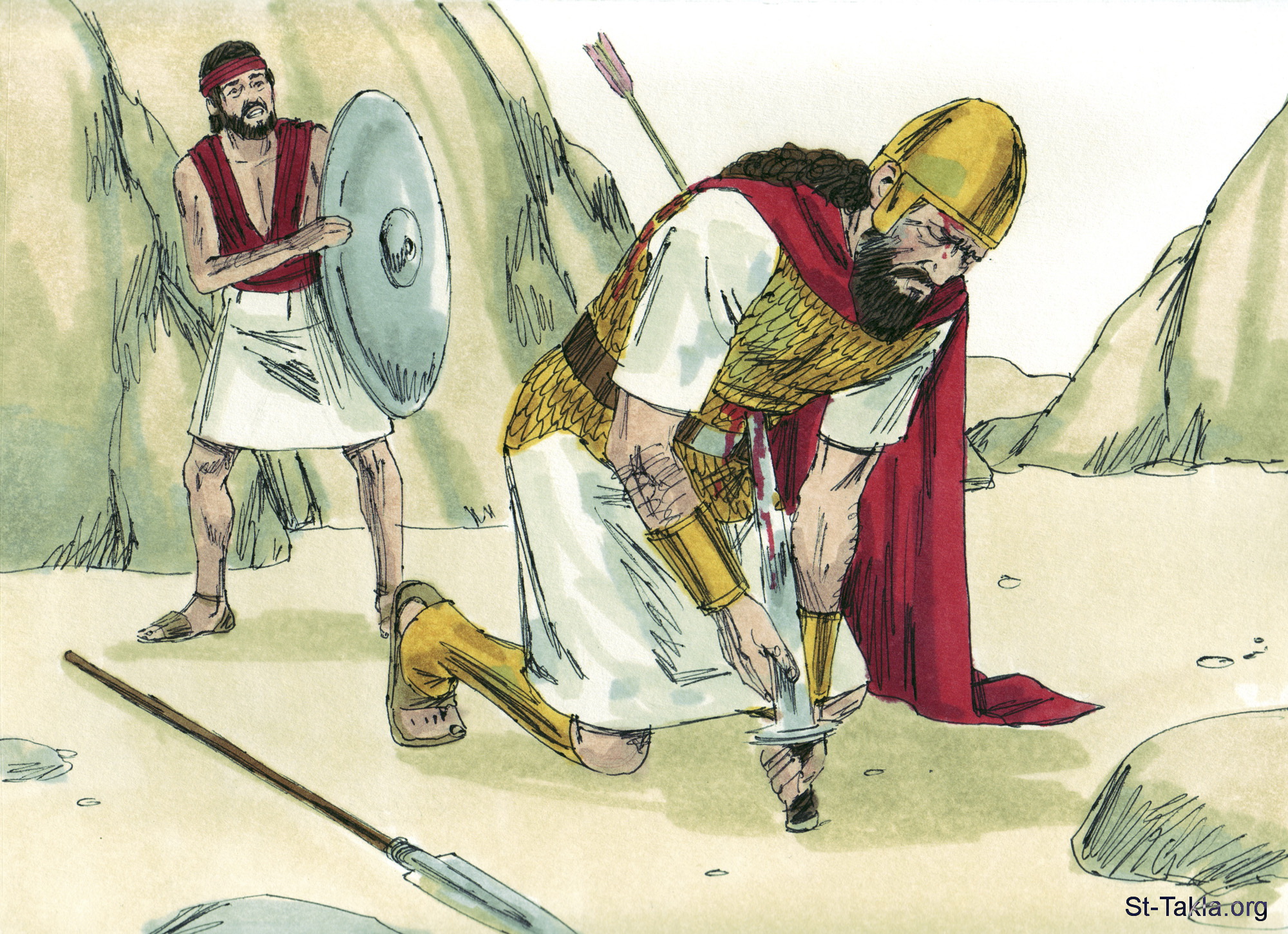 "واشتدت الحرب على شاول فأصابته رماة القسي، فانجرح من الرماة. فقال شاول لحامل سلاحه: «استل سيفك واطعني به لئلا يأتي هؤلاء الغلف ويقبحوني». فلم يشأ حامل سلاحه لأنه خاف جدا. فأخذ شاول السيف وسقط عليه" (أخبار الأيام الأول 10: 3-4) - صور سفر أخبار الأيام الأول، رسم جيمز بادجيت (1931-2009)، إصدار شركة سويت ميديا.