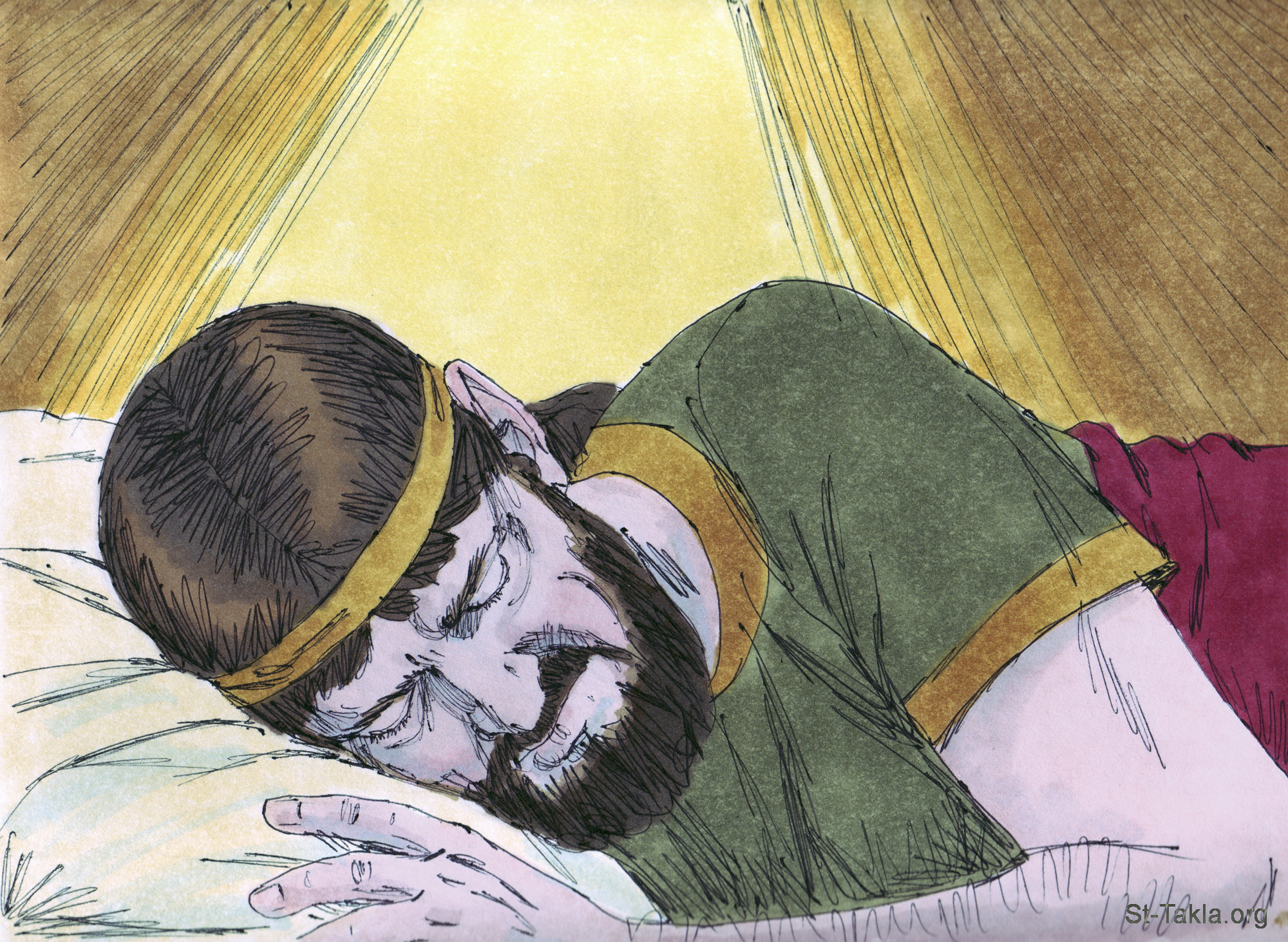 "وفي تلك الليلة كان كلام الله إلى ناثان قائلا: «اذهب وقل لداود عبدي: هكذا قال الرب: أنت لا تبني لي بيتا للسكنى، لأني لم أسكن في بيت منذ يوم أصعدت إسرائيل إلى هذا اليوم، بل سرت من خيمة إلى خيمة، ومن مسكن إلى مسكن. في كل ما سرت مع جميع إسرائيل، هل تكلمت بكلمة مع أحد قضاة إسرائيل الذين أمرتهم أن يرعوا شعبي إسرائيل قائلا: لماذا لم تبنوا لي بيتا من أرز؟ والآن فهكذا تقول لعبدي داود: هكذا قال رب الجنود: أنا أخذتك من المربض، من وراء الغنم لتكون رئيسا على شعبي إسرائيل، وكنت معك حيثما توجهت، وقرضت جميع أعدائك من أمامك، وعملت لك اسما كاسم العظماء الذين في الأرض. وعينت مكانا لشعبي إسرائيل وغرسته فسكن في مكانه، ولا يضطرب بعد، ولا يعود بنو الإثم يبلونه كما في الأول، ومنذ الأيام التي فيها أقمت قضاة على شعبي إسرائيل. وأذللت جميع أعدائك. وأخبرك أن الرب يبني لك بيتا. ويكون متى كملت أيامك لتذهب مع آبائك، أني أقيم بعدك نسلك الذي يكون من بنيك وأثبت مملكته. هو يبني لي بيتا وأنا أثبت كرسيه إلى الأبد. أنا أكون له أبا وهو يكون لي ابنا، ولا أنزع رحمتي عنه كما نزعتها عن الذي كان قبلك. وأقيمه في بيتي وملكوتي إلى الأبد، ويكون كرسيه ثابتا إلى الأبد». فحسب جميع هذا الكلام وحسب كل هذه الرؤيا كذلك كلم ناثان داود" (أخبار الأيام الأول 17: 3-15) - صور سفر أخبار الأيام الأول، رسم جيمز بادجيت (1931-2009)، إصدار شركة سويت ميديا.