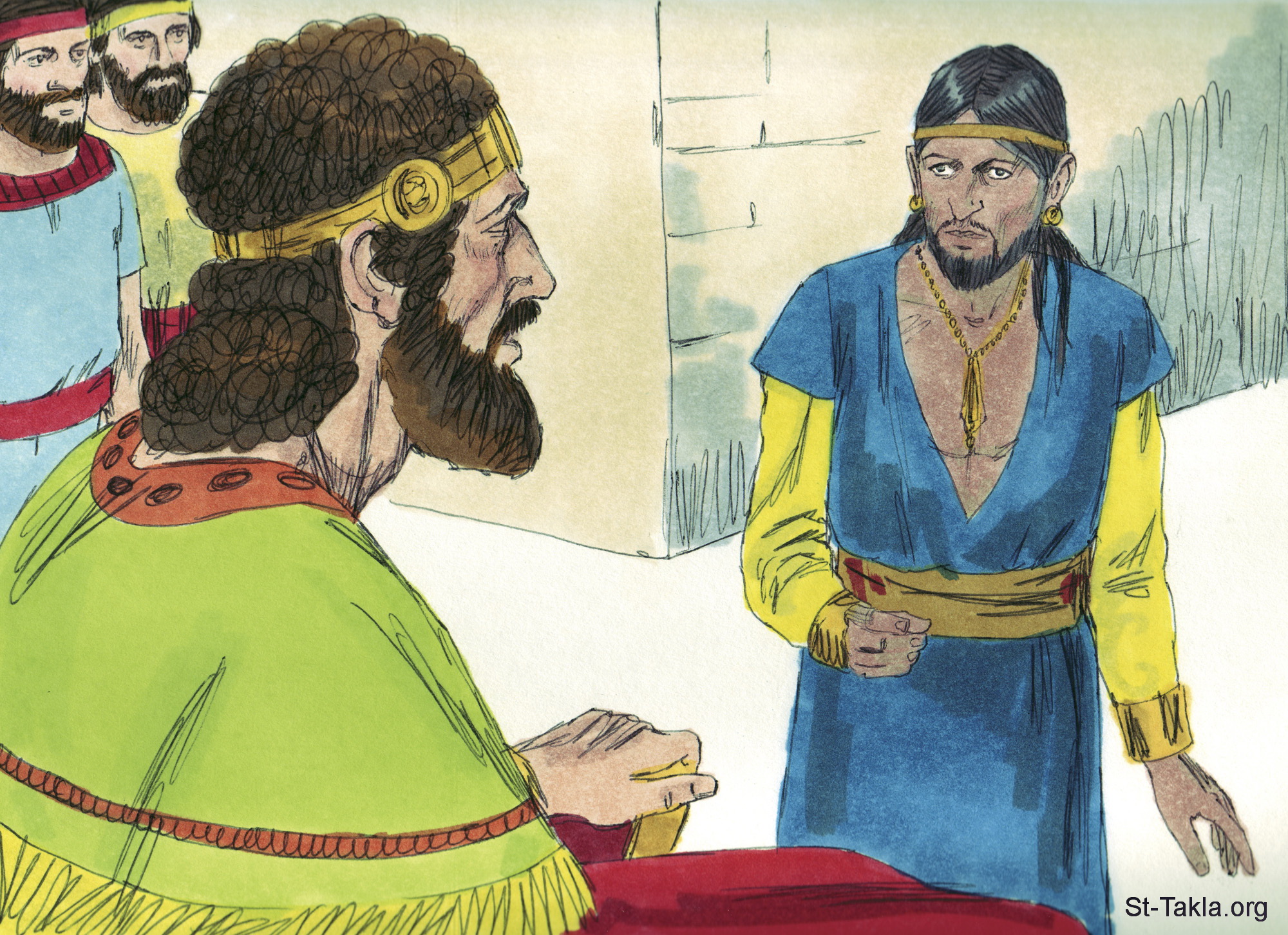 "وكان بعد ذلك أن ناحاش ملك بني عمون مات، فملك ابنه عوضا عنه. فقال داود: «أصنع معروفا مع حانون بن ناحاش، لأن أباه صنع معي معروفا». فأرسل داود رسلا ليعزيه بأبيه" (أخبار الأيام الأول 19: 1-2) - صور سفر أخبار الأيام الأول، رسم جيمز بادجيت (1931-2009)، إصدار شركة سويت ميديا.