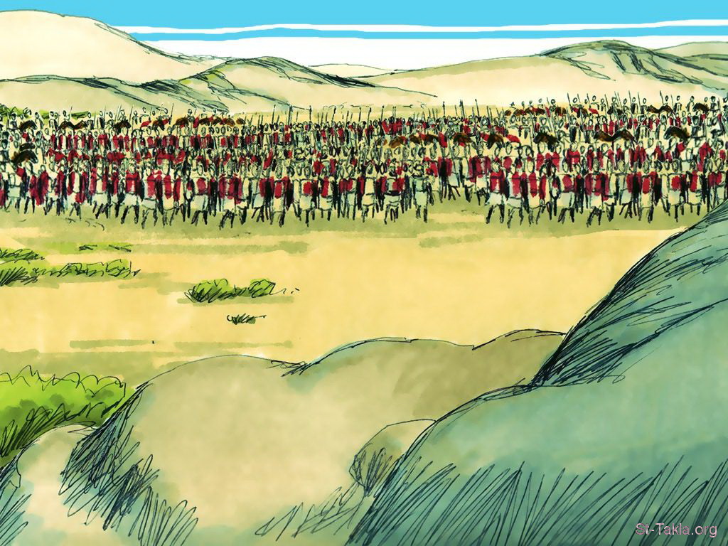 دخل أبيا الحرب بنصف عدد جيش يربعام: 400,000 جندي (أخبار الأيام الثاني 13: 3) - مجموعة "حرب الملك أبيا على الملك يربعام" (أخبار الأيام الثاني 13: 1-22) - صورة (6) - صور سفر أخبار الأيام الثاني، رسم جيمز بادجيت (1931-2009)، إصدار شركة سويت ميديا.