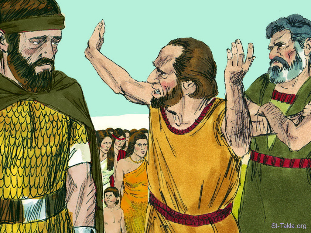"ثم قام رجال من رؤوس بني أفرايم: عزريا بن يهوحانان، وبرخيا بن مشليموت، ويحزقيا بن شلوم، وعماسا بن حدلاي على المقبلين من الجيش" (أخبار الأيام الثاني 28: 12) - مجموعة "عوديد النبي ينقذ النساء والأطفال من السبي" (أخبار الأيام الثاني 28: 1-14) - صورة (16) - صور سفر أخبار الأيام الثاني، رسم جيمز بادجيت (1931-2009)، إصدار شركة سويت ميديا.
