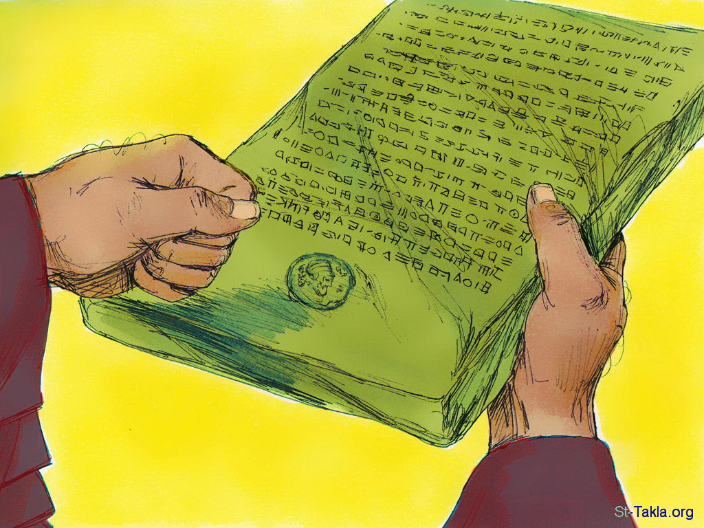 "فوجد في أحمثا، في القصر الذي في بلاد مادي، درج مكتوب فيه هكذا: «تذكار. في السنة الأولى لكورش الملك، أمر كورش الملك من جهة بيت الله في أورشليم: ليبن البيت، المكان الذي يذبحون فيه ذبائح، ولتوضع أسسه، ارتفاعه ستون ذراعا وعرضه ستون ذراعا. بثلاثة صفوف من حجارة عظيمة، وصف من خشب جديد. ولتعط النفقة من بيت الملك. وأيضا آنية بيت الله، التي من ذهب وفضة، التي أخرجها نبوخذنصر من الهيكل الذي في أورشليم وأتى بها إلى بابل، فلترد وترجع إلى الهيكل الذي في أورشليم إلى مكانها، وتوضع في بيت الله" (عزرا 6: 2-5) - صور سفر عزرا، رسم جيمز بادجيت (1931-2009)، إصدار شركة سويت ميديا.