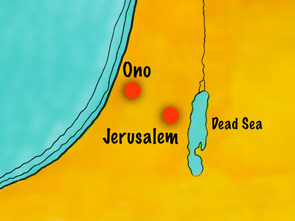 خريطة: "وكانا يفكران أن يعملا بي شرا. فأرسلت إليهما رسلا قائلا: «إني أنا عامل عملا عظيما فلا أقدر أن أنزل. لماذا يبطل العمل بينما أتركه وأنزل إليكما؟»" (نحميا 6: 2-3) - مجموعة "مواجهة مقاومة الأعداء لبناء أسوار أورشليم" (نحميا 3-6) - صورة (17) - صور سفر نحميا، (1931-2009)، إصدار شركة سويت ميديا.