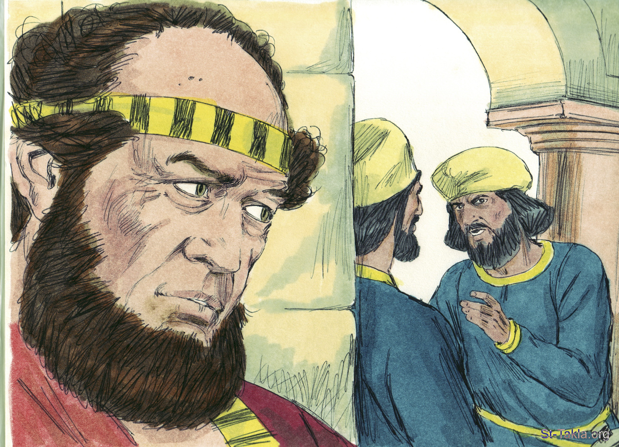 "ولما جمعت العذارى ثانية كان مردخاي جالسا بباب الملك. ولم تكن أستير أخبرت عن جنسها وشعبها كما أوصاها مردخاي. وكانت أستير تعمل حسب قول مردخاي كما كانت في تربيتها عنده. في تلك الأيام، بينما كان مردخاي جالسا في باب الملك، غضب بغثان وترش خصيا الملك حارسا الباب، وطلبا أن يمدا أيديهما إلى الملك أحشويروش. فعلم الأمر عند مردخاي، فأخبر أستير الملكة، فأخبرت أستير الملك باسم مردخاي" (أستير 2: 19-22) - صور سفر أستير، رسم جيمز بادجيت (1931-2009)، إصدار شركة سويت ميديا.