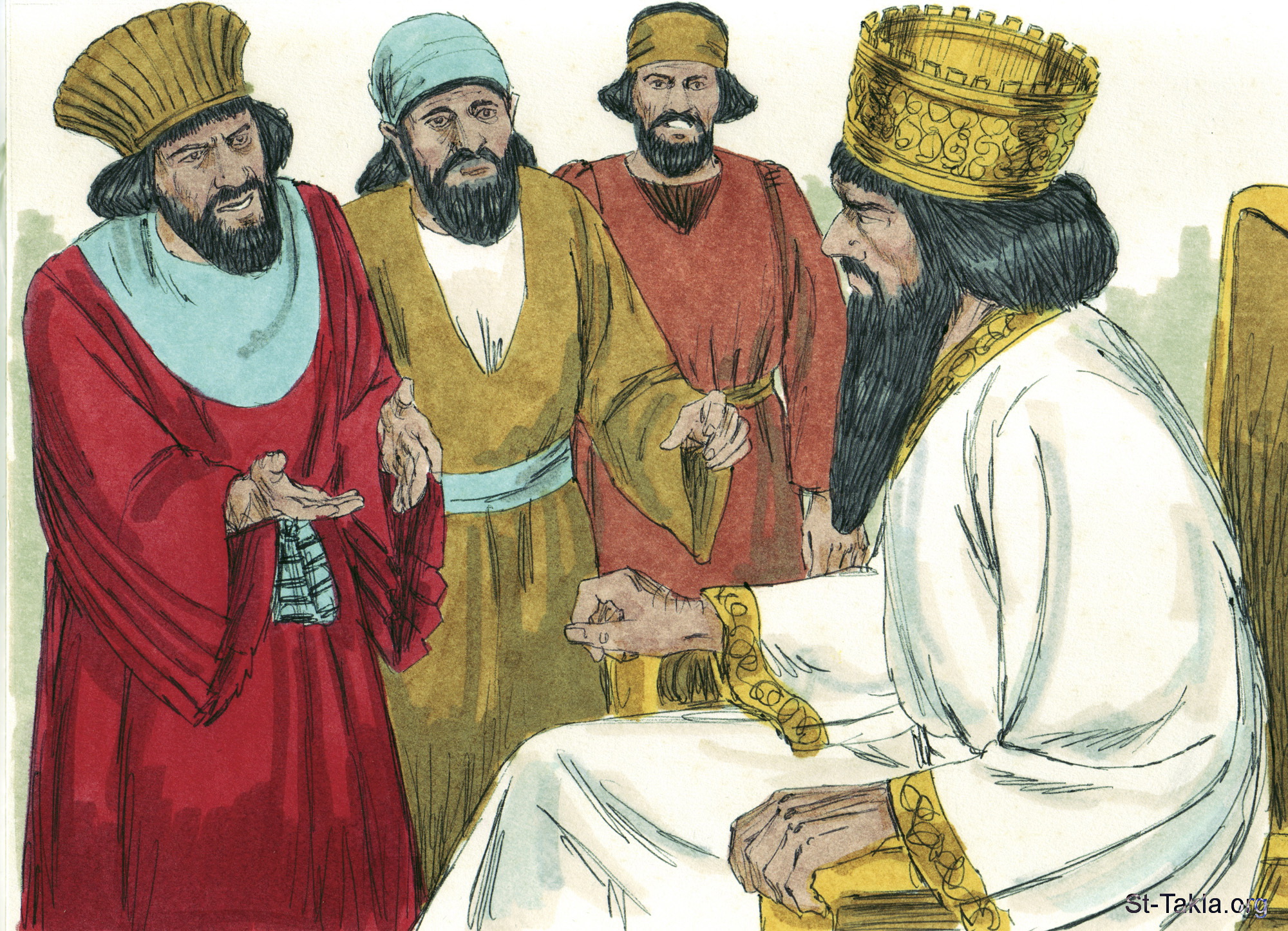 "فاجتمع حينئذ هؤلاء الرجال فوجدوا دانيآل يطلب ويتضرع قدام إلهه. فتقدموا وتكلموا قدام الملك في نهي الملك: «ألم تمض أيها الملك نهيا بأن كل إنسان يطلب من إله أو إنسان حتى ثلاثين يوما إلا منك أيها الملك يطرح في جب الأسود؟» فأجاب الملك وقال: «الأمر صحيح كشريعة مادي وفارس التي لا تنسخ». حينئذ أجابوا وقالوا قدام الملك: «إن دانيآل الذي من بني سبي يهوذا لم يجعل لك أيها الملك اعتبارا ولا للنهي الذي أمضيته، بل ثلاث مرات في اليوم يطلب طلبته»" (دانيال 6: 11-13) - مجموعة "دانيال النبي في جُب الأسود" (دانيال 6: 1-28) - صورة (8) - صور سفر دانيال، رسم جيمز بادجيت (1931-2009)، إصدار شركة سويت ميديا.