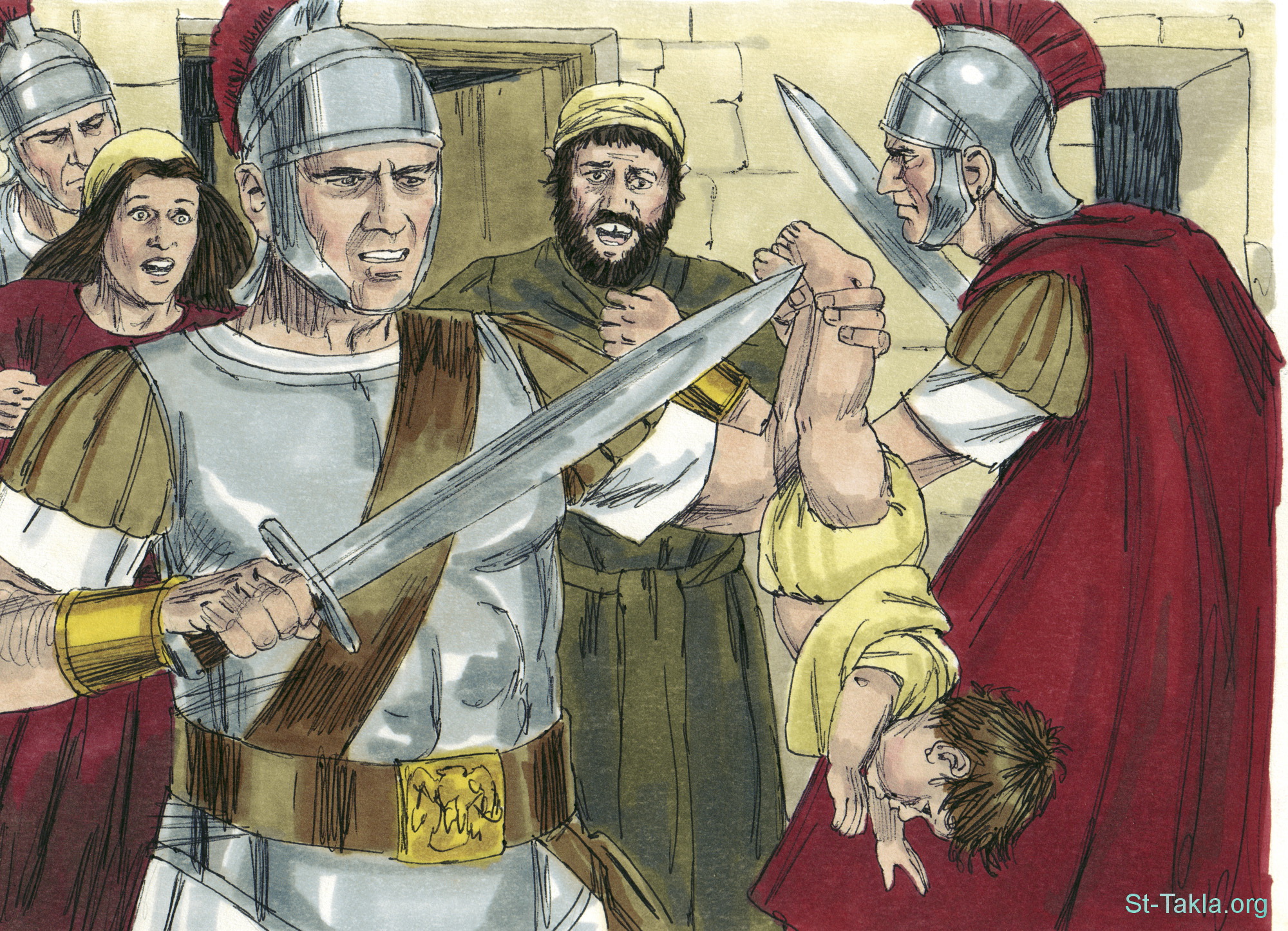 "حينئذ لما رأى هيرودس أن المجوس سخروا به غضب جدا. فأرسل وقتل جميع الصبيان الذين في بيت لحم وفي كل تخومها، من ابن سنتين فما دون، بحسب الزمان الذي تحققه من المجوس. حينئذ تم ما قيل بإرميا النبي القائل: «صوت سمع في الرامة، نوح وبكاء وعويل كثير. راحيل تبكي على أولادها ولا تريد أن تتعزى، لأنهم ليسوا بموجودين»" (متى 2: 16-18) - مجموعة "زيارة المجوس ليسوع" (متى 2: 1-14) - صورة (12) - صور الأناجيل الأربعة، رسم جيمز بادجيت (1931-2009)، إصدار شركة سويت ميديا.