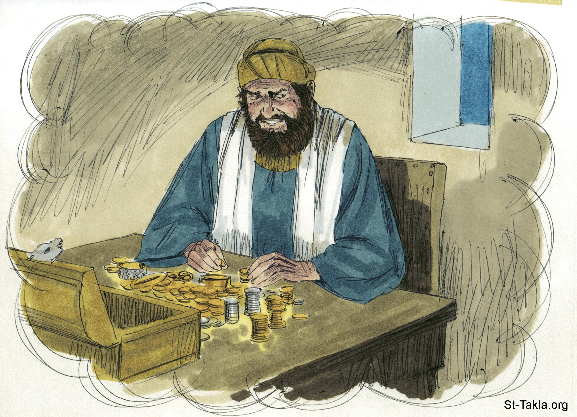 "لا تكنزوا لكم كنوزا على الأرض حيث يفسد السوس والصدأ، وحيث ينقب السارقون ويسرقون. بل اكنزوا لكم كنوزا في السماء، حيث لا يفسد سوس ولا صدأ، وحيث لا ينقب سارقون ولا يسرقون، لأنه حيث يكون كنزك هناك يكون قلبك أيضا" (متى 6: 19-21) - صور إنجيل متى، رسم جيمز بادجيت (1931-2009)، إصدار شركة سويت ميديا.