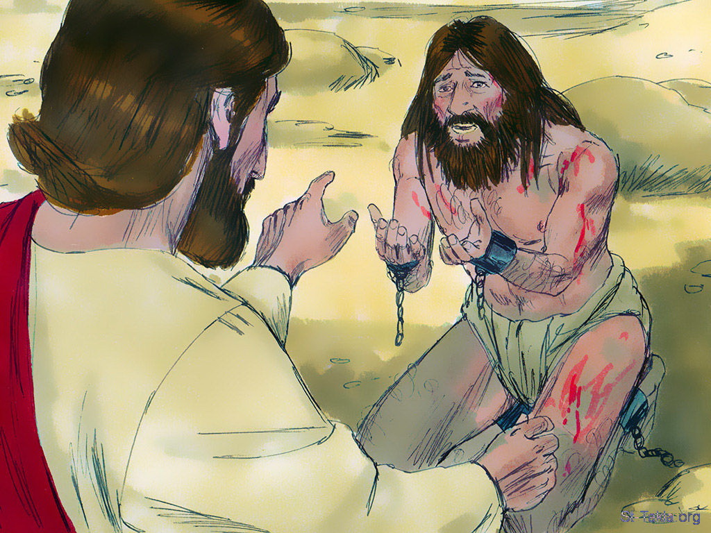 "وكان بعيدا منهم قطيع خنازير كثيرة ترعى" (متى 8: 30) - "وسأله: «ما اسمك؟» فأجاب قائلا: «اسمي لجئون، لأننا كثيرون». وطلب إليه كثيرا أن لا يرسلهم إلى خارج الكورة" (مرقس 5: 9-10) - "فسأله يسوع قائلا: «ما اسمك؟» فقال: «لجئون». لأن شياطين كثيرة دخلت فيه. وطلب إليه أن لا يأمرهم بالذهاب إلى الهاوية" (لوقا 8: 30-31) - مجموعة "يسوع يشفي المجنون" (متى 8: 28-34, مرقس 5: 5-20, لوقا 8: 26-39) - صورة (7) - صور الأناجيل الأربعة، رسم جيمز بادجيت (1931-2009)، إصدار شركة سويت ميديا.