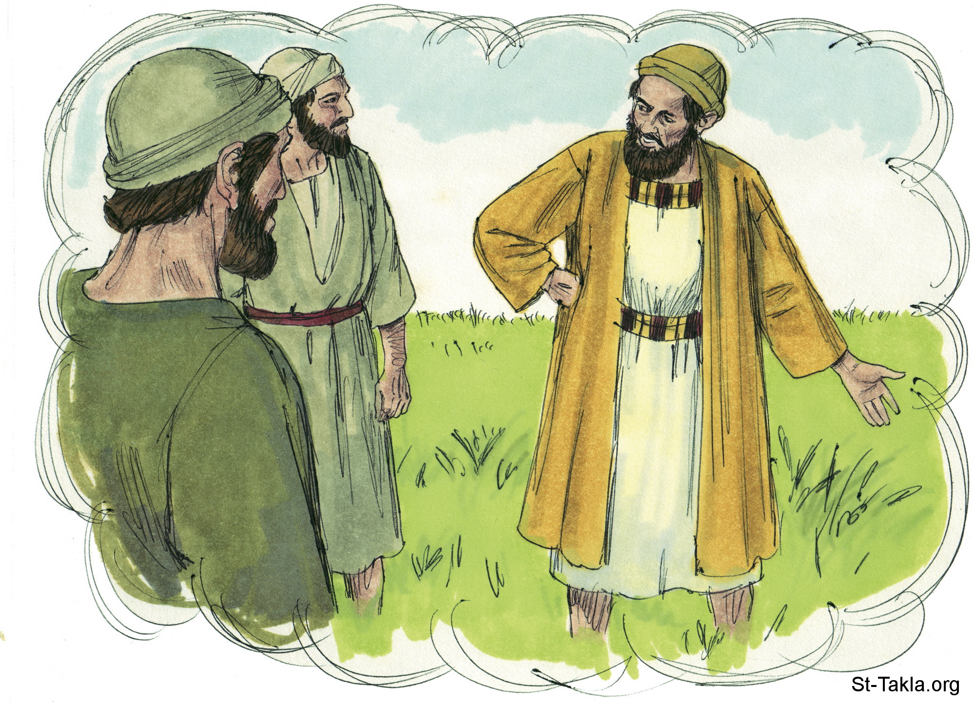 "فقال لهم: إنسان عدو فعل هذا. فقال له العبيد: أتريد أن نذهب ونجمعه؟ فقال: لا! لئلا تقلعوا الحنطة مع الزوان وأنتم تجمعونه. دعوهما ينميان كلاهما معا إلى الحصاد، وفي وقت الحصاد أقول للحصادين: اجمعوا أولا الزوان واحزموه حزما ليحرق، وأما الحنطة فاجمعوها إلى مخزني" (متى 13: 28-30) - مجموعة "مثل الحنطة والزوان في الحقل" (متى 13: 24-30, متى 13: 36-43) - صورة (5) - صور الأناجيل الأربعة، رسم جيمز بادجيت (1931-2009)، إصدار شركة سويت ميديا.