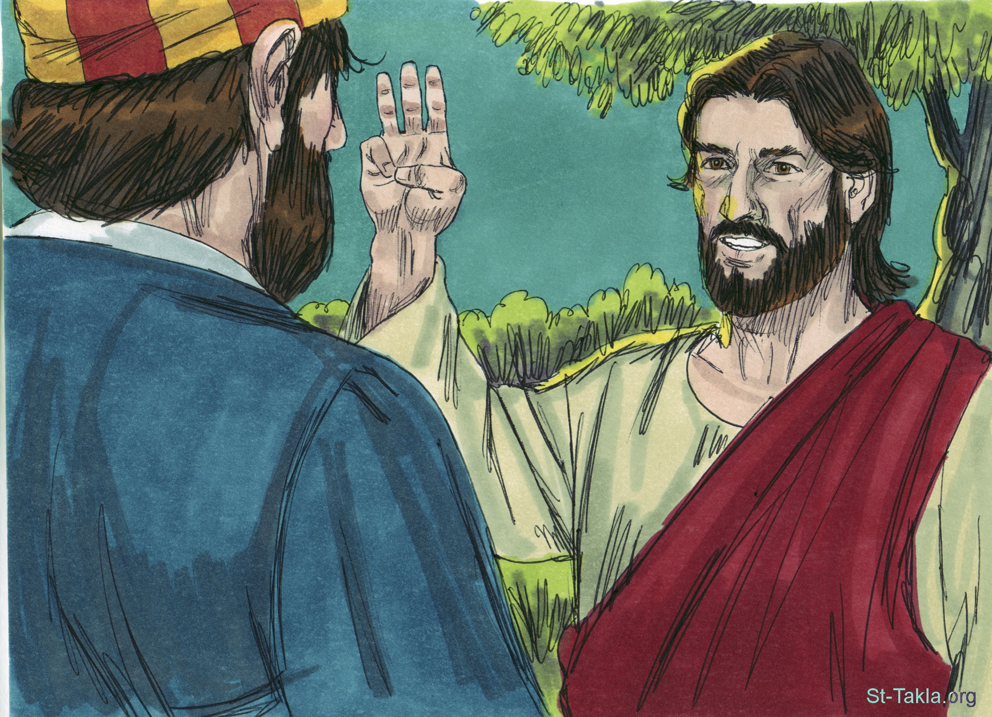 "قال له يسوع: «الحق أقول لك: إنك في هذه الليلة قبل أن يصيح ديك تنكرني ثلاث مرات»" (متى 26: 34) - "فقال له يسوع: «الحق أقول لك: إنك اليوم في هذه الليلة، قبل أن يصيح الديك مرتين، تنكرني ثلاث مرات»" (مرقس 14: 30) - "فقال: «أقول لك يا بطرس: لا يصيح الديك اليوم قبل أن تنكر ثلاث مرات أنك تعرفني»" (لوقا 22: 34) - مجموعة "بستان جثسيماني ونكران بطرس" (متى 26: 30-75, مرقس 14: 26-72 , لوقا 22: 31-71, يوحنا 18: 1-27) - صورة (3) - صور الأناجيل الأربعة، رسم جيمز بادجيت (1931-2009)، إصدار شركة سويت ميديا.