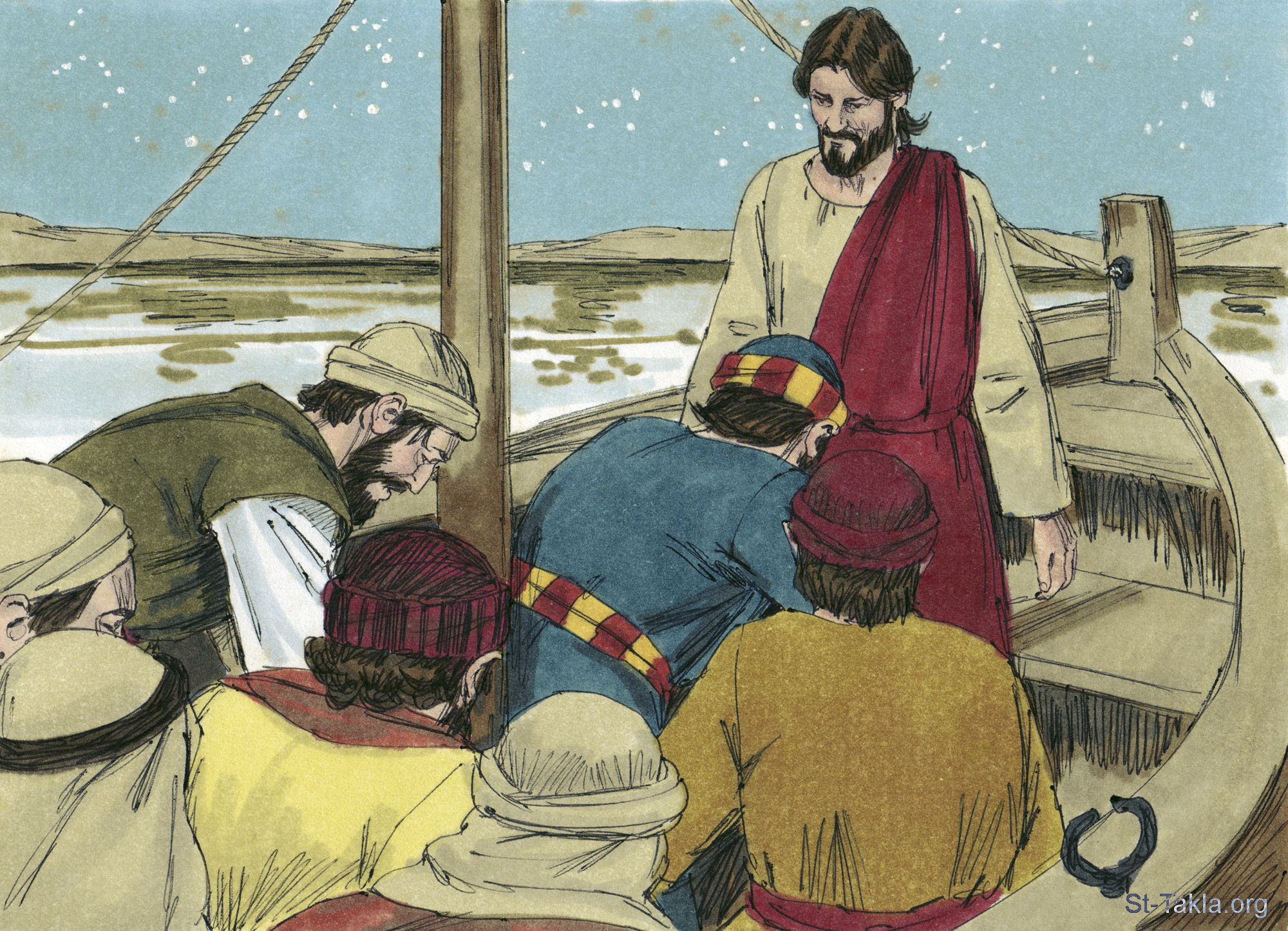 "فصعد إليهم إلى السفينة فسكنت الريح، فبهتوا وتعجبوا في أنفسهم جدا إلى الغاية، لأنهم لم يفهموا بالأرغفة إذ كانت قلوبهم غليظة" (مرقس 6: 51-52) - "ولما دخلا السفينة سكنت الريح. والذين في السفينة جاءوا وسجدوا له قائلين: «بالحقيقة أنت ابن الله!»" (متى 14: 32-33) - "فرضوا أن يقبلوه في السفينة. وللوقت صارت السفينة إلى الأرض التي كانوا ذاهبين إليها" (يوحنا 6: 21) - مجموعة "يسوع يمشي على الماء" (متى 14: 22-36, مرقس 6: 45-56, يوحنا 6: 16-24) - صورة (11) - صور الأناجيل الأربعة، رسم جيمز بادجيت (1931-2009)، إصدار شركة سويت ميديا.