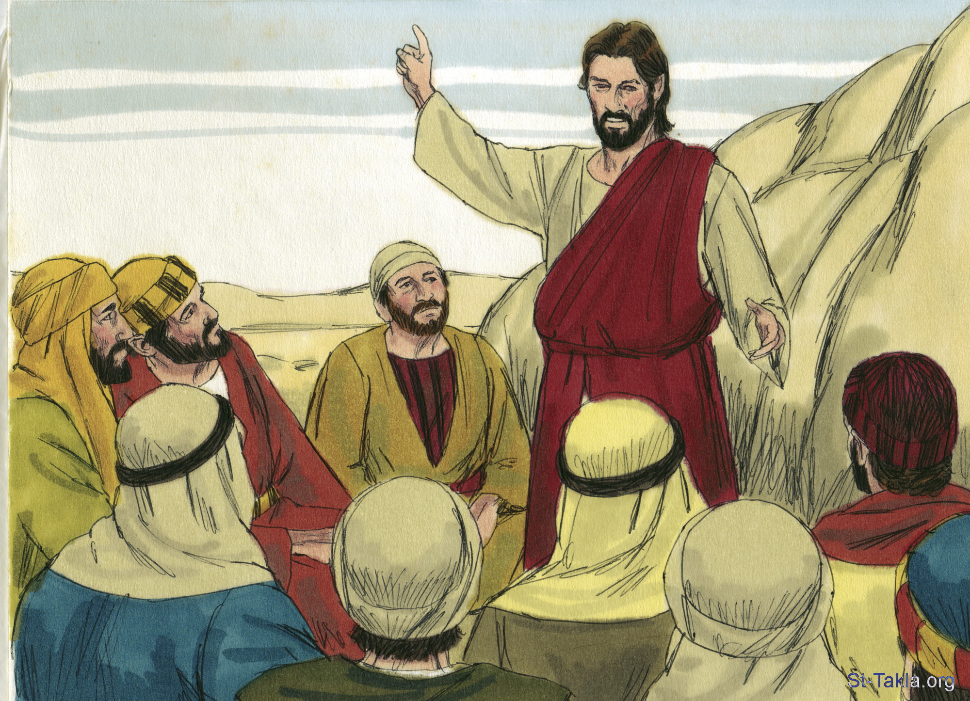 "فدعاهم يسوع وقال لهم: أنتم تعلمون أن الذين يحسبون رؤساء الأمم يسودونهم، وأن عظماءهم يتسلطون عليهم" (مرقس 10: 42) - مجموعة "يعقوب ويوحنا يطلبان الأولوية" (مرقس 10: 32-45) - صورة (9) - صور الأناجيل الأربعة، رسم جيمز بادجيت (1931-2009)، إصدار شركة سويت ميديا.