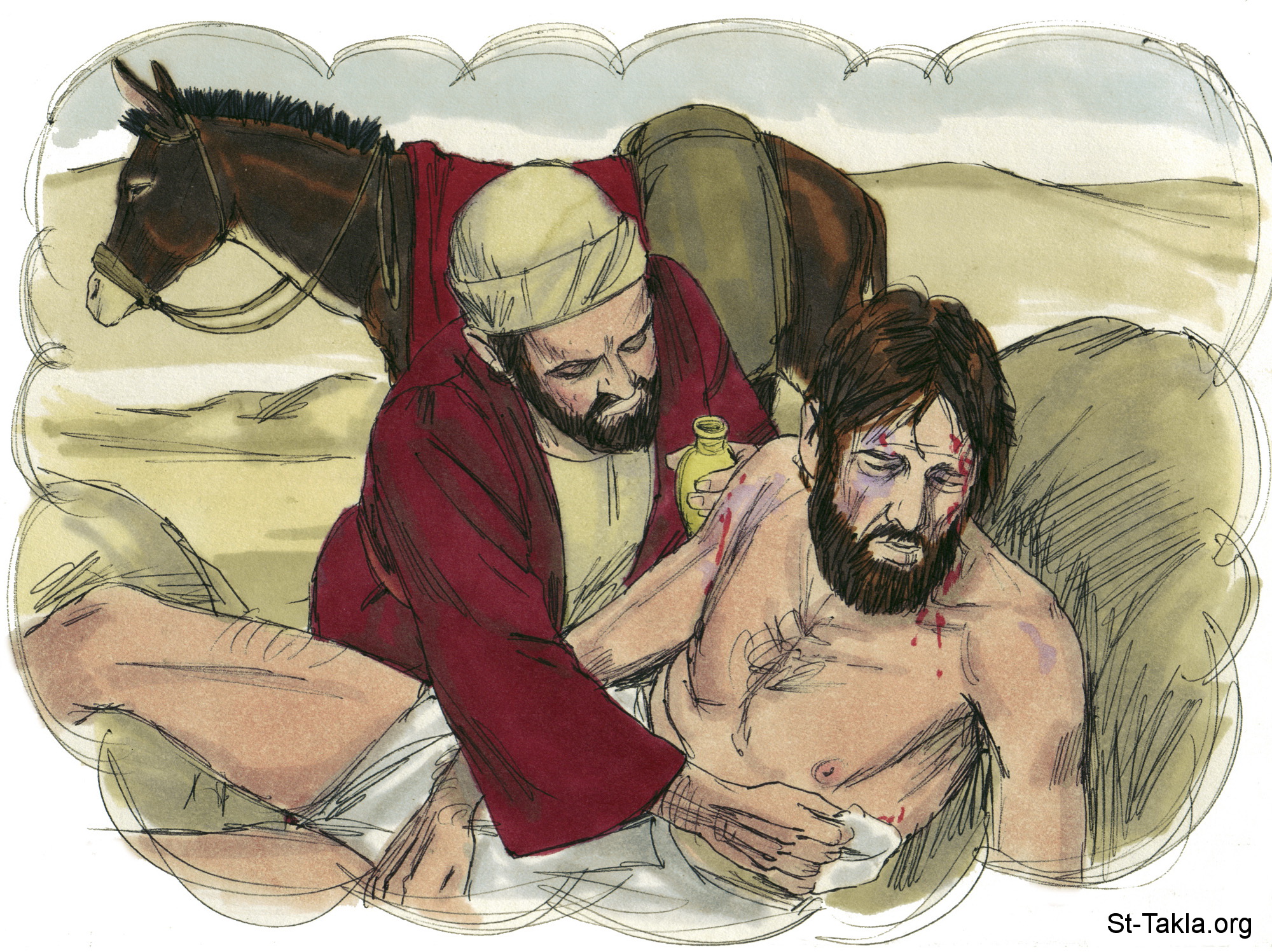 "ولكن سامريا مسافرا جاء إليه، ولما رآه تحنن، فتقدم وضمد جراحاته، وصب عليها زيتا وخمرا" (لوقا 10: 33-34) - مجموعة "مثل السامري الصالح" (لوقا 10: 25-37) - صورة (9) - صور الأناجيل الأربعة، رسم جيمز بادجيت (1931-2009)، إصدار شركة سويت ميديا.