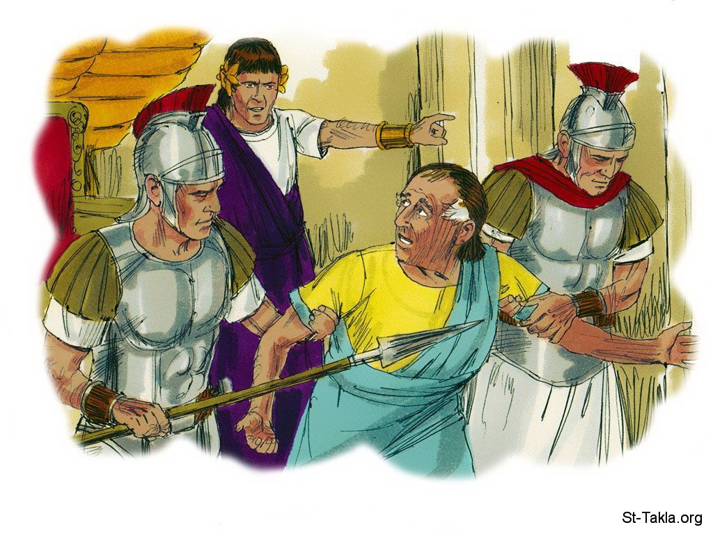 "وقبل هذا كله يلقون أيديهم عليكم ويطردونكم، ويسلمونكم إلى مجامع وسجون، وتساقون أمام ملوك وولاة لأجل اسمي. فيؤول ذلك لكم شهادة" (لوقا 21: 12-13) - "وحينئذ يعثر كثيرون ويسلمون بعضهم بعضا ويبغضون بعضهم بعضا" (متى 24: 10) - "فانظروا إلى نفوسكم. لأنهم سيسلمونكم إلى مجالس، وتجلدون في مجامع، وتوقفون أمام ولاة وملوك، من أجلي، شهادة لهم. وينبغي أن يكرز أولا بالإنجيل في جميع الأمم" (مرقس 13: 9-10) - مجموعة "يسوع يتحدث عن أمور مستقبلية" (متى 24: 1-35, مرقس 13: 1-31, لوقا 21: 5-38) - صورة (8) - صور الأناجيل الأربعة، رسم جيمز بادجيت (1931-2009)، إصدار شركة سويت ميديا.