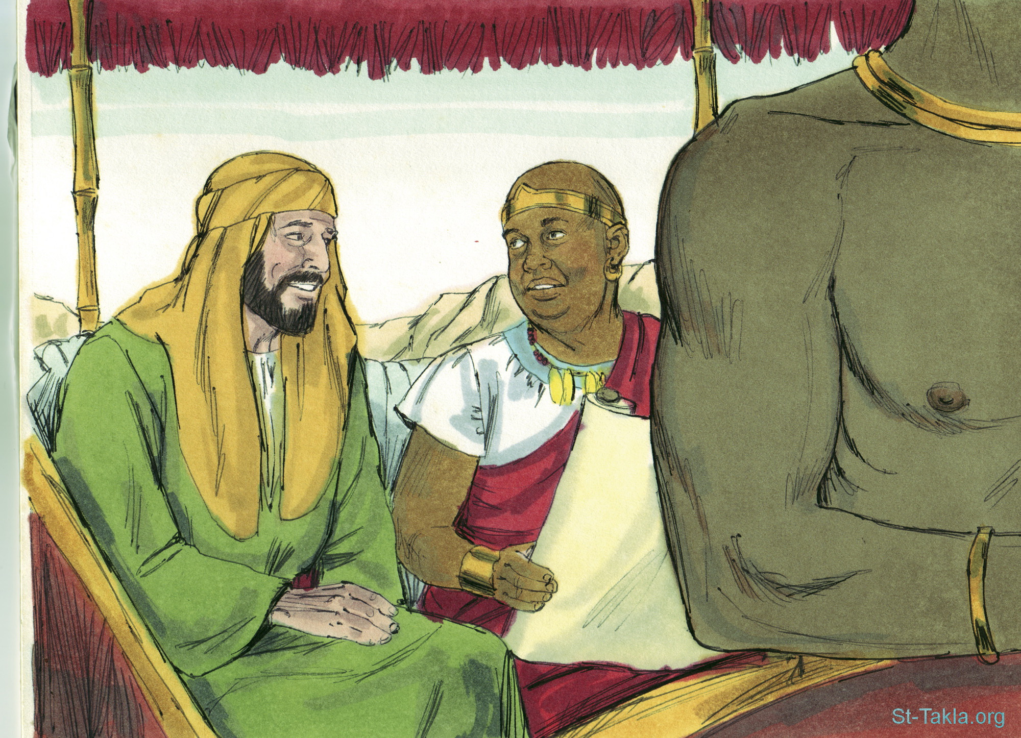 "وطلب إلى فيلبس أن يصعد ويجلس معه" (أعمال الرسل 8: 31) - مجموعة "فيلبس والوزير الإثيوبي" (أعمال الرسل 8: 26-40) - صورة (4) - صور سفر أعمال الرسل، رسم جيمز بادجيت (1931-2009)، إصدار شركة سويت ميديا.