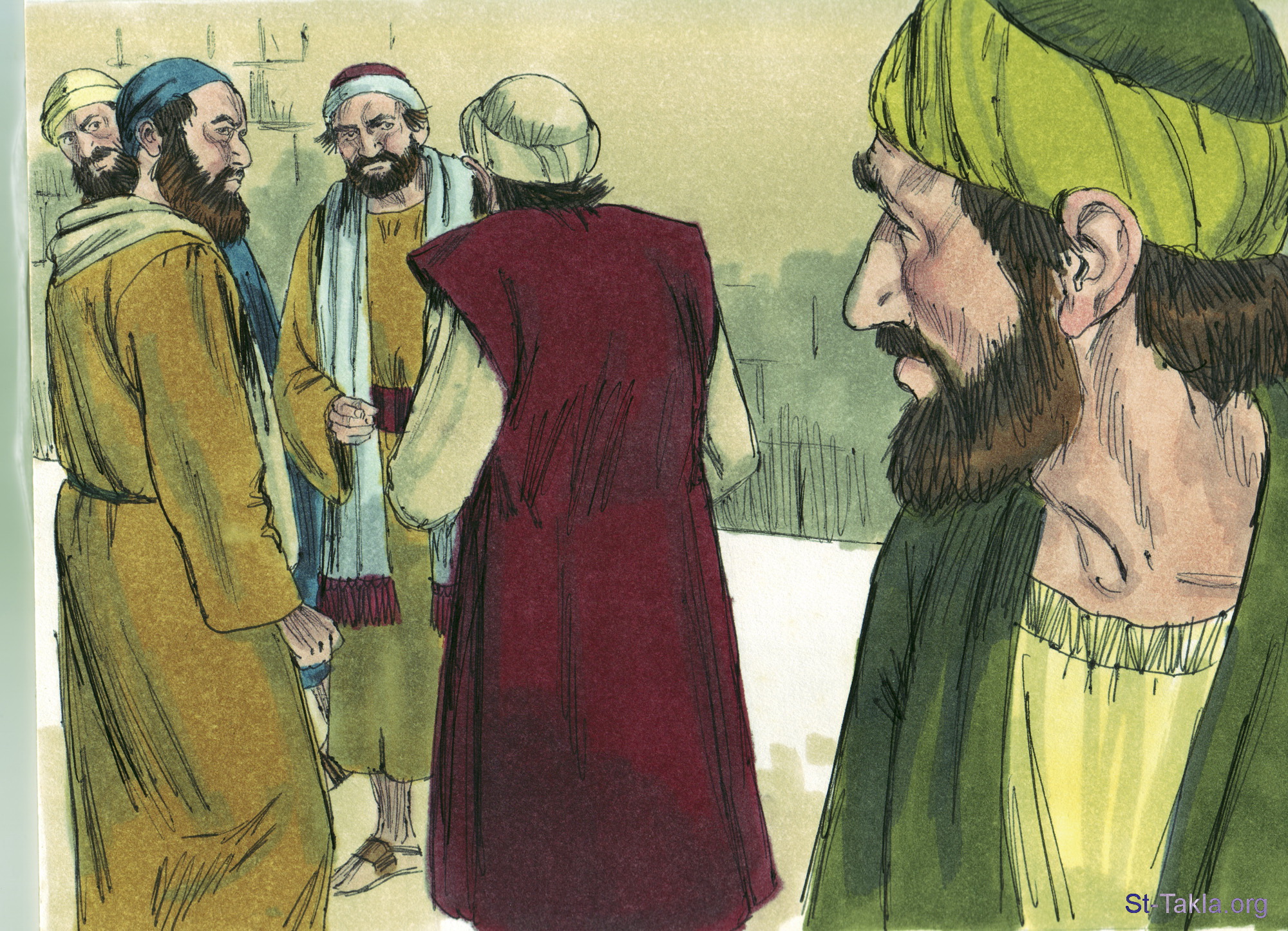 "ولما جاء شاول إلى أورشليم حاول أن يلتصق بالتلاميذ، وكان الجميع يخافونه غير مصدقين أنه تلميذ" (أعمال الرسل 9: 26) - مجموعة "اهتداء شاول (بولس)" (أعمال الرسل 9: 1-31) - صورة (21) - صور سفر أعمال الرسل، رسم جيمز بادجيت (1931-2009)، إصدار شركة سويت ميديا.