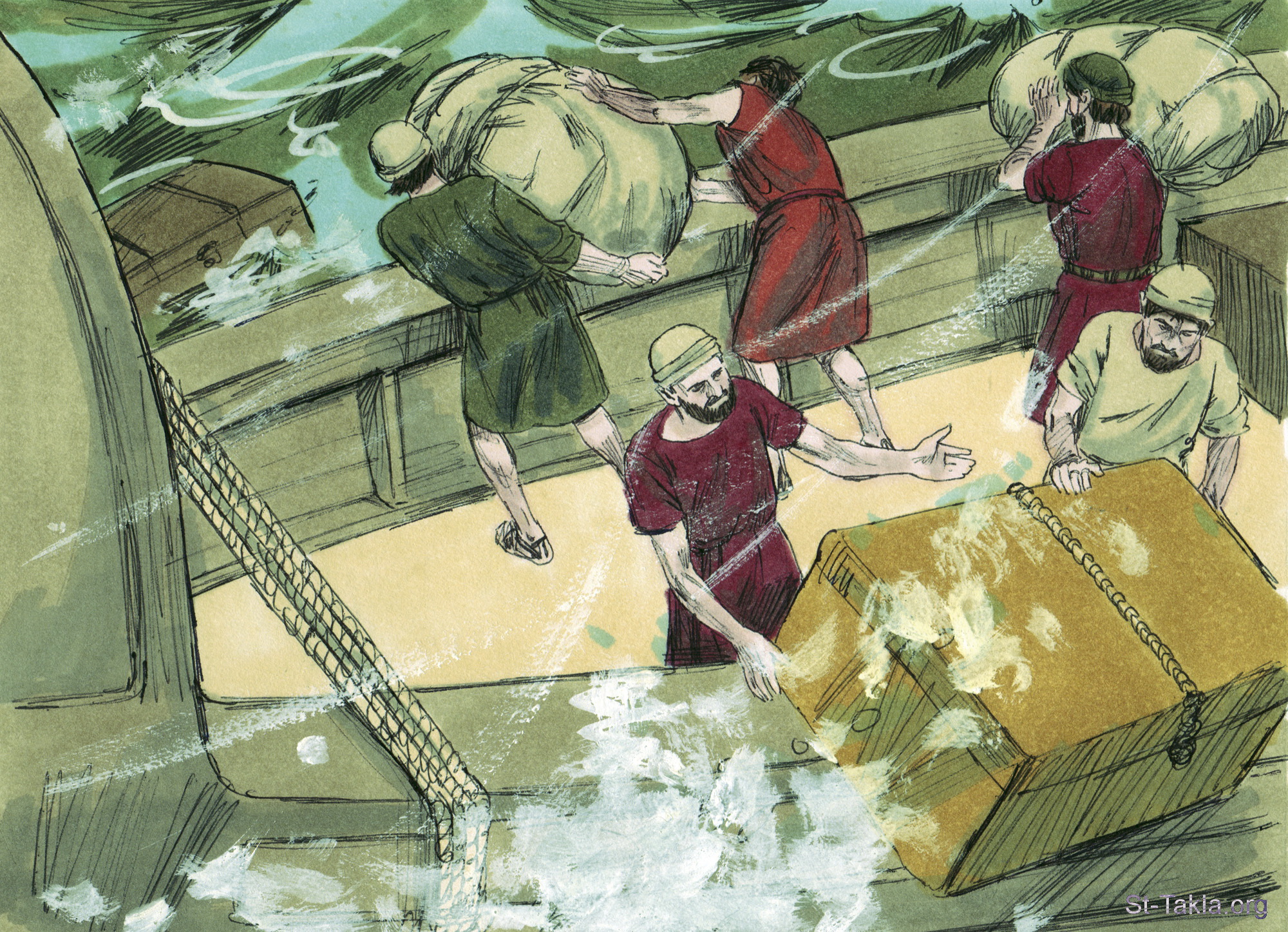 "وإذ كنا في نوء عنيف، جعلوا يفرغون في الغد" (أعمال الرسل 27: 18) - مجموعة "انكسار السفينة ببولس" (أعمال الرسل 27: 1-44) - صورة (10) - صور سفر أعمال الرسل، رسم جيمز بادجيت (1931-2009)، إصدار شركة سويت ميديا.