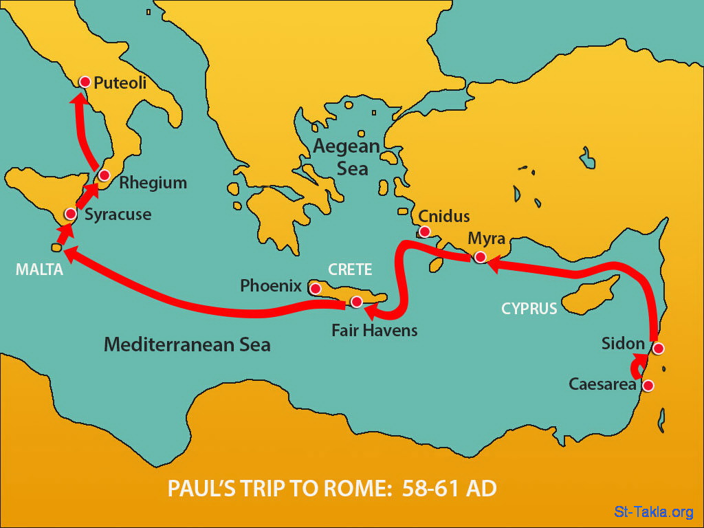 خريطة: رحلة بولس الرسول إلى روما (58-61 م.): "فنزلنا إلى سراكوسا ومكثنا ثلاثة أيام. ثم من هناك درنا وأقبلنا إلى ريغيون. وبعد يوم واحد حدثت ريح جنوب، فجئنا في اليوم الثاني إلى بوطيولي" (أعمال الرسل 28: 12-13) - مجموعة "عودة بولس إلى روما" (أعمال الرسل 28: 1-31) - صورة (6) - صور سفر أعمال الرسل (1931-2009)، إصدار شركة سويت ميديا.