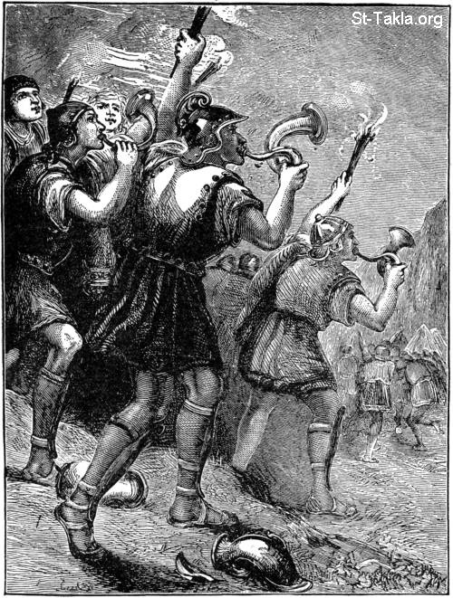 "فضربت الفرق الثلاث بالأبواق وكسروا الجرار، وأمسكوا المصابيح بأيديهم اليسرى والأبواق بأيديهم اليمنى ليضربوا بها، وصرخوا: «سيف للرب ولجدعون»" (القضاة 7: 20) - من صور كتاب قصص تحكيها الأم من العهد القديم