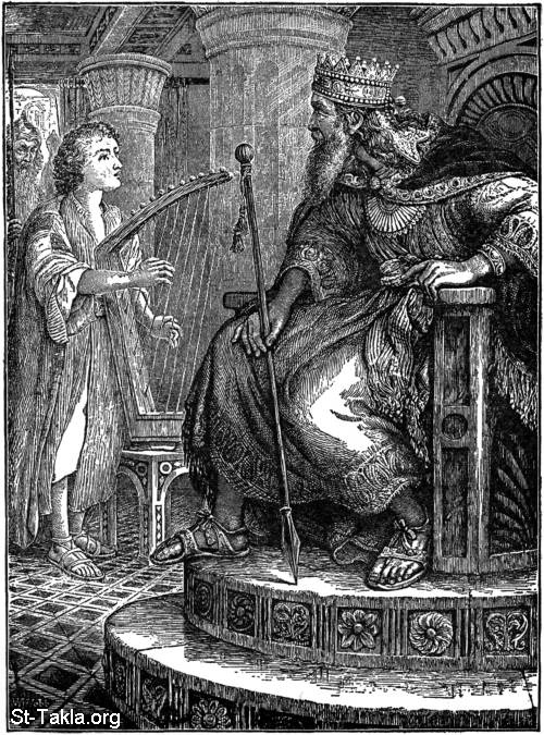 داود يلعب على القيثار لتهدئة شاول الملك - من صور كتاب قصص تحكيها الأم من العهد القديم