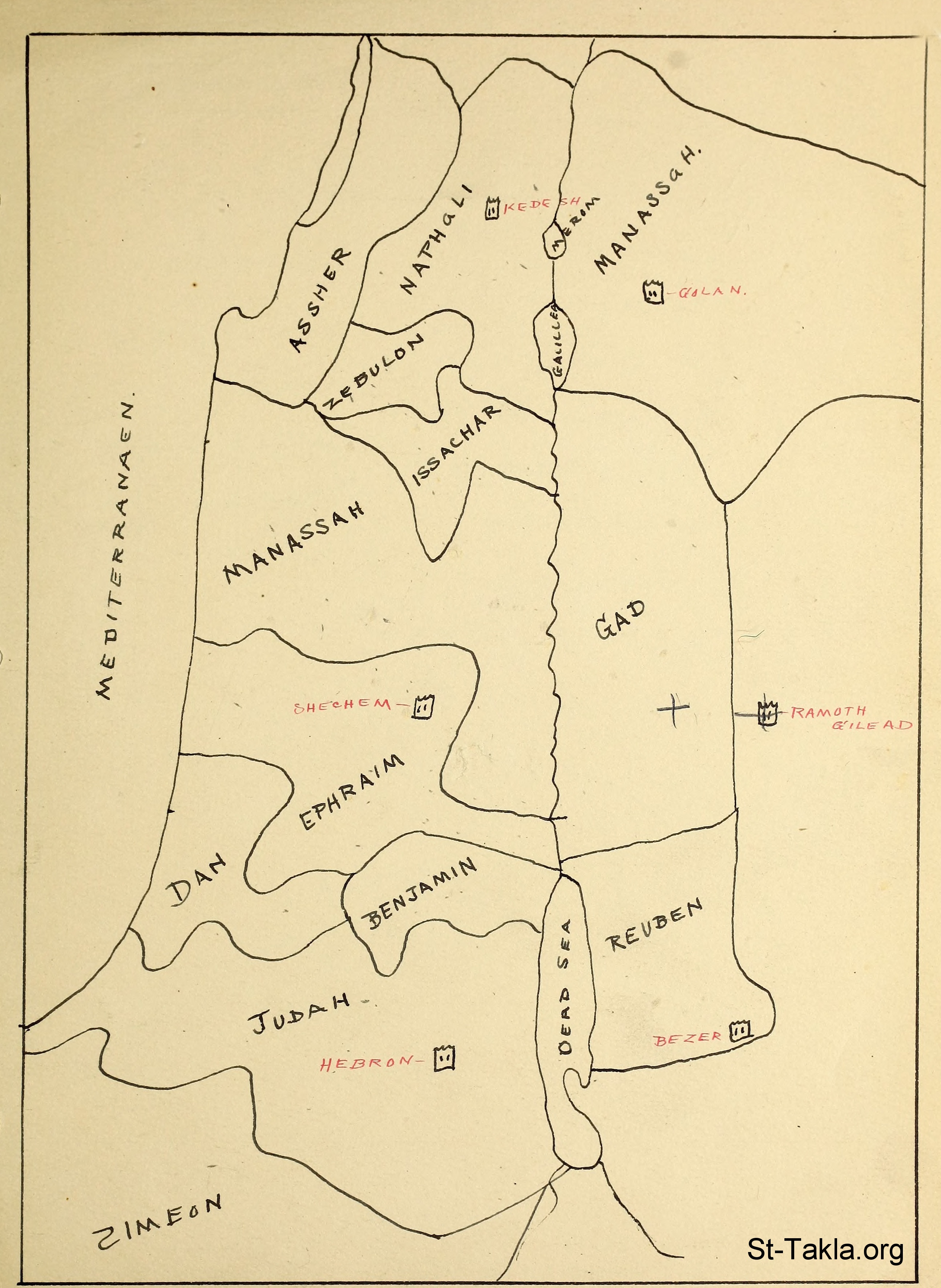 خريطة تقسيم كنعان على الأسباط - من صور كتاب أطلس الكتاب المقدس (راند ماكنالي)، جيسي ليمان هيرلبت، 1910 م.