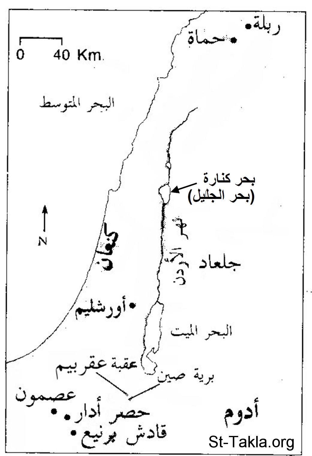 خريطة بالعربية تصور حدود أرض كنعان، ويظهر فيها الأماكن التالية: البحر المتوسط - ربلة - حماة - بحر كنارة (بحر الجليل) - نهر الأردن - جلعاد - البحر الميت - أورشليم - برية صين - عقبة عقربيم - أدوم - حصر أدار - عصمون - قادش برنيع.