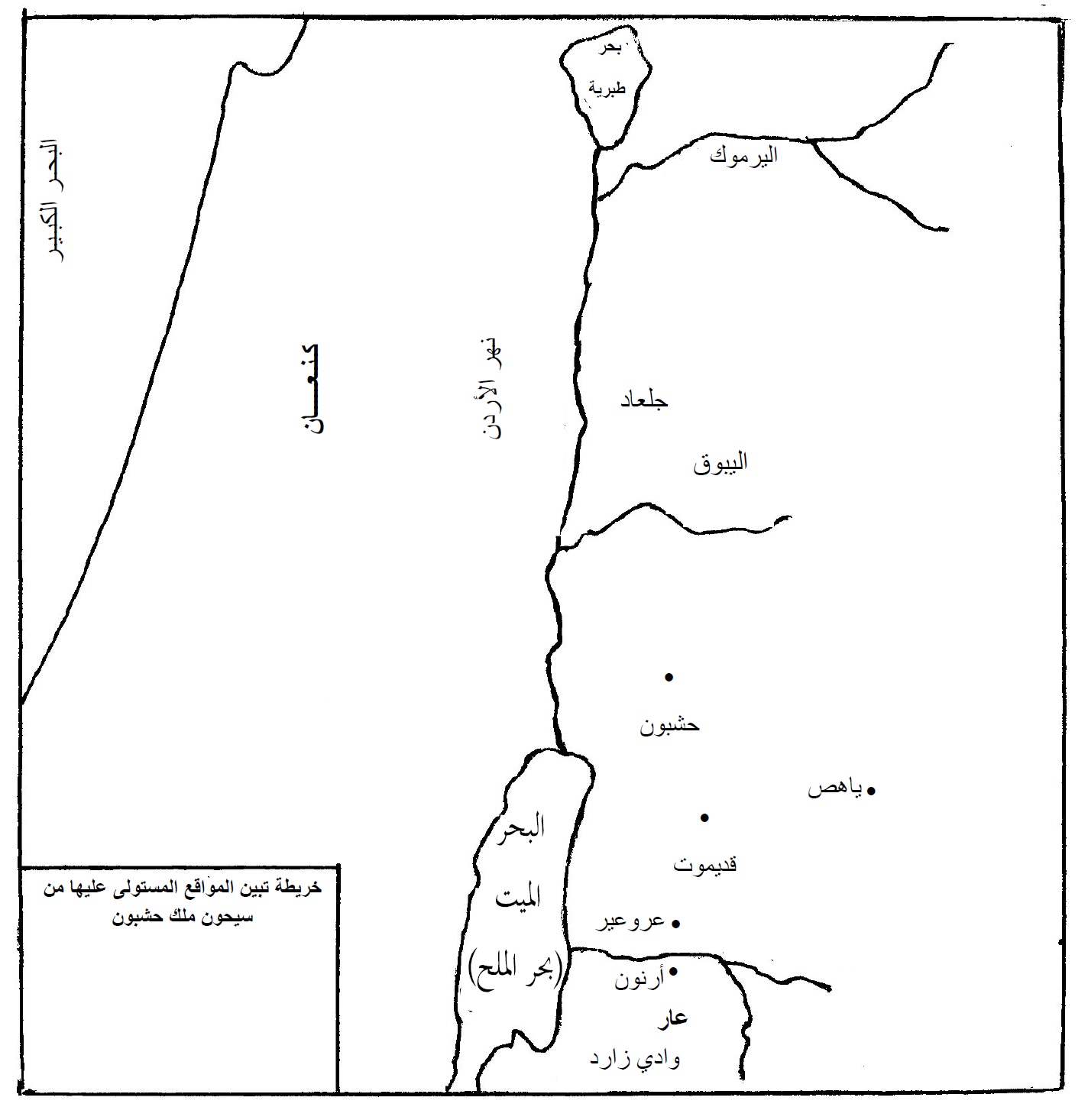 خريطة بالعربية تبين المواقع المستولى عليها من سيحون ملك حشبون، ويظهر بها كذلك بعض الأماكن في العهد القديم: البحر الكبير (البحر المتوسط) - بحر طبرية - اليرموك - نهر الأردن - كنعان - جلعاد - اليبوق - حشبون - ياهص - قديموت - البحر الميت (بحر الملح) - عروعير - أرنون - عار - وادي زارد.