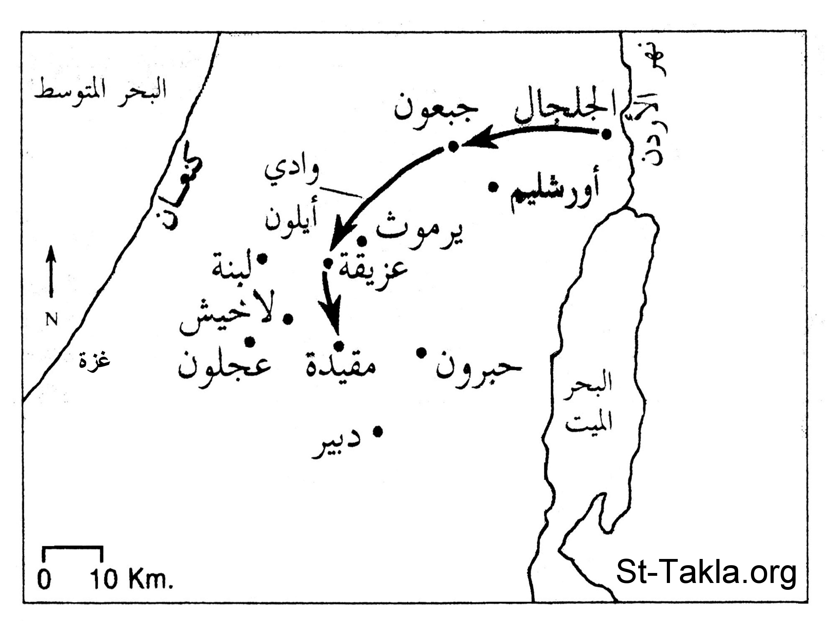 خريطة بالعربية تصور الحرب ضد يشوع (يشوع 10)، مع بعض الأماكن في العهد القديم: البحر المتوسط - كنعان - غزة - نهر الأردن - الجلجال - أورشليم - جبعون - يرموث - وادي أيلون - عزيقة - لبنة - لاخيش - عجلون - مقيدة - دبير - البحر الميت.